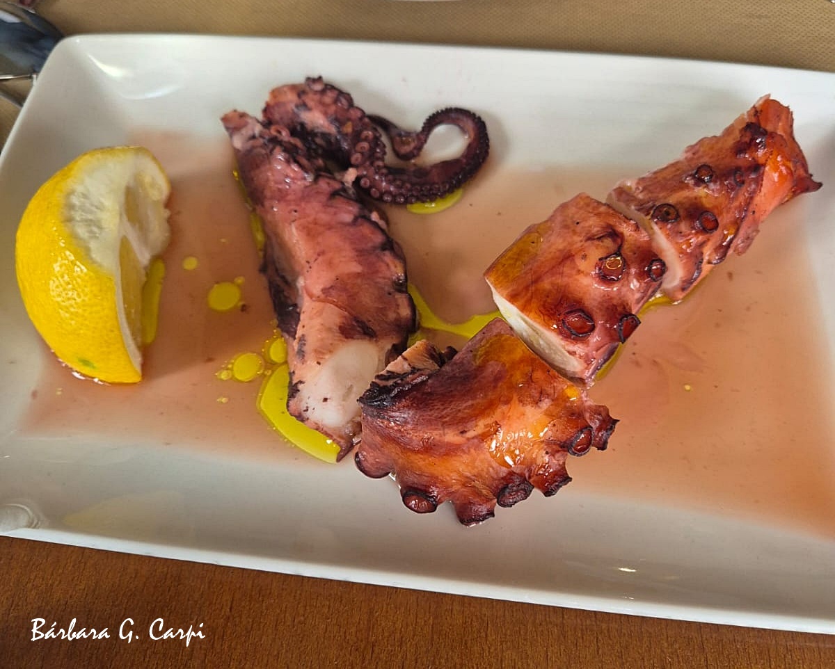 Primero limpiar la bolsa del pulpo así como las ventosas y congelarlo. Descongelamos y cocemos en abundante agua con un corcho durante 30 minutos. Asamos el pulpo ya cocido con su jugo de cocción durante otros 30 minutos y gratinar despoués durante otros 5 minutos de manera que quede tierno por dentro y crujiene por fuera, Troceamos con unas tijeras, aliñamos con zumo de limón y aceite de oliva y una pizca de sal. Hay quién le pone en el horno, cerveza, vino blanco seco y brandy y una hoja de laurel, pero son mistificaciones; la auténtica es la que he puesto y como aperitivo no tiene precio: ¡divino!