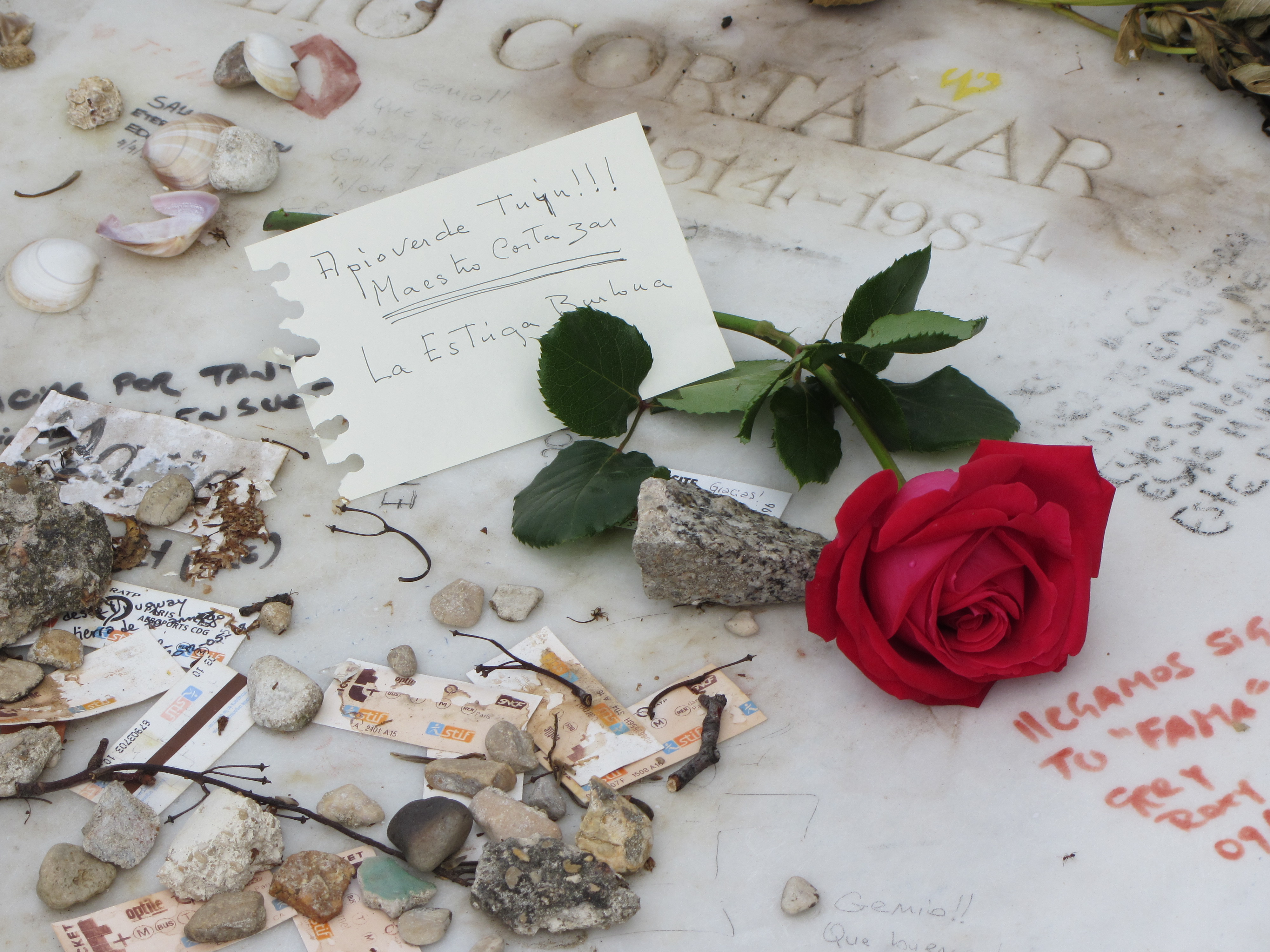 Acabamos de estar en París. París, oh là là, bien merece una misa -incluso para los republicanos-, y el susto de un viaje en avión entre turbulencias y aterrizajes de infarto. Tres días escasos e intensos; allí los momentos se escapan entre los dedos o se eternizan, según si estamos permeables, con todos los sentidos alerta para captar el otro lado de las cosas. Teníamos una cita con el Maestro en Montparnasse. Llegamos por el Boulevard Edgar-Quinet y entramos por la puerta principal; iba tranquila, acompañada del mejor guía que conozco; él, con el mapa en la mano, iba seguro entre el laberinto de tumbas. Yo, un poco rezagada, mientras subía por el paseo, veía a lo lejos cómo el Ángel del Sueño Eterno de la rotonda se iba agrandando, impasible en su pedestal o, por efecto, pensaba, del sol, se empequeñecía y era un traveling a su capricho. Mentalmente le retaba: esta vez no se iba a reír de mí, «¡me cachendió!», como diría el Maestro. ¡Esta vez la iba a encontrar, él me acompañaba! A la altura de l’Allée Lenoir estaba la tumba 23 , ¡por fin!, acompañada por la de Gaston Maspero, profesor en el Colegio de Francia y de la de Cesar Baldaccini, escultor; estaba pues bien acompañado. El acceso a su parcela terrenal estaba cercada: interdit, passage interdit, pensé acostumbrada como estoy a pensar en francés cada vez que piso los empedrados, los adoquines. ¡Ah, no!, nada ni nadie nos lo iba a impedir. Salvamos el obstáculo yendo por detrás de las cintas que agarraban árboles sin ningún sentido. La lápida está dividida en dos cuadrados blancos; en el de arriba, el nombre de su segunda mujer, Carole -es todo un caballero-, y en el de abajo su nombre, y las dos fechas en las que se encierra una vida. Sobre la tumba, un sin fin de billetes de metro, flores secas, notas, cigarrillos y escritos de admiración en rotulador azul y rojo -el dibujo- directamente sobre el mármol para que la tinta penetre de corazón a corazón. Sobre la tumba una escultura divertida, como no podía ser menos, que para mí es la representación y la esencia del cronopio, teniendo en cuenta la descripción que hace de ellos y de cómo se le aparecieron por primera vez en el entreacto de un concierto de obras de Stravinski dirigido por él mismo y en el cual Jean Cocteau recitaba «Edipo Rey». Fue en el año 51 y acababa de llegar a Francia. Había entrado en «état second», como dicen los franceses. Al fondo la torre de Montparnasse, como guardiana del descanso de quien no descansó en su hacer, en sus compromisos políticos, de amistad. Un rato conversando con él nos hizo más fácil el hasta siempre. Le dejamos una rosa roja fresca con dos notas y dos piedras, una blanca y otra redonda con un agujero en el centro a modo de cenicero; antes de volver sobre nuestros pasos compartimos unos cigarillos con él mientras un cuervo iba de una rivera a otra de l’Allée Principal. Y ¡me cachendió!, al Maestro lo han colocado en la rive droite!