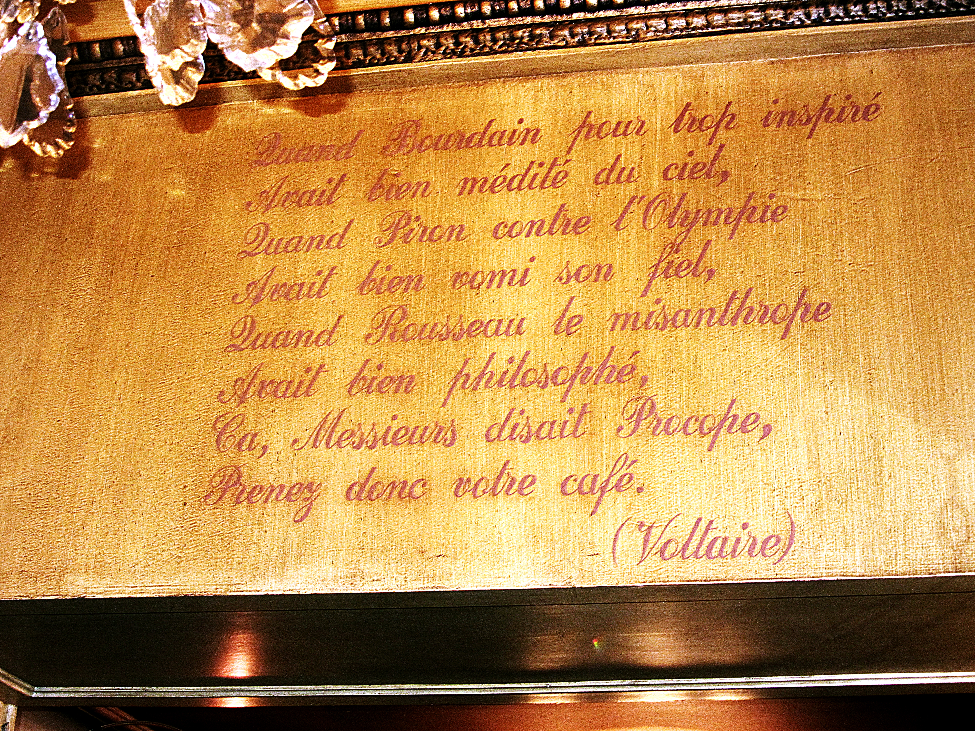Texto de Voltaire en el interior del café Procope, Paris. Foto: Bárbara
