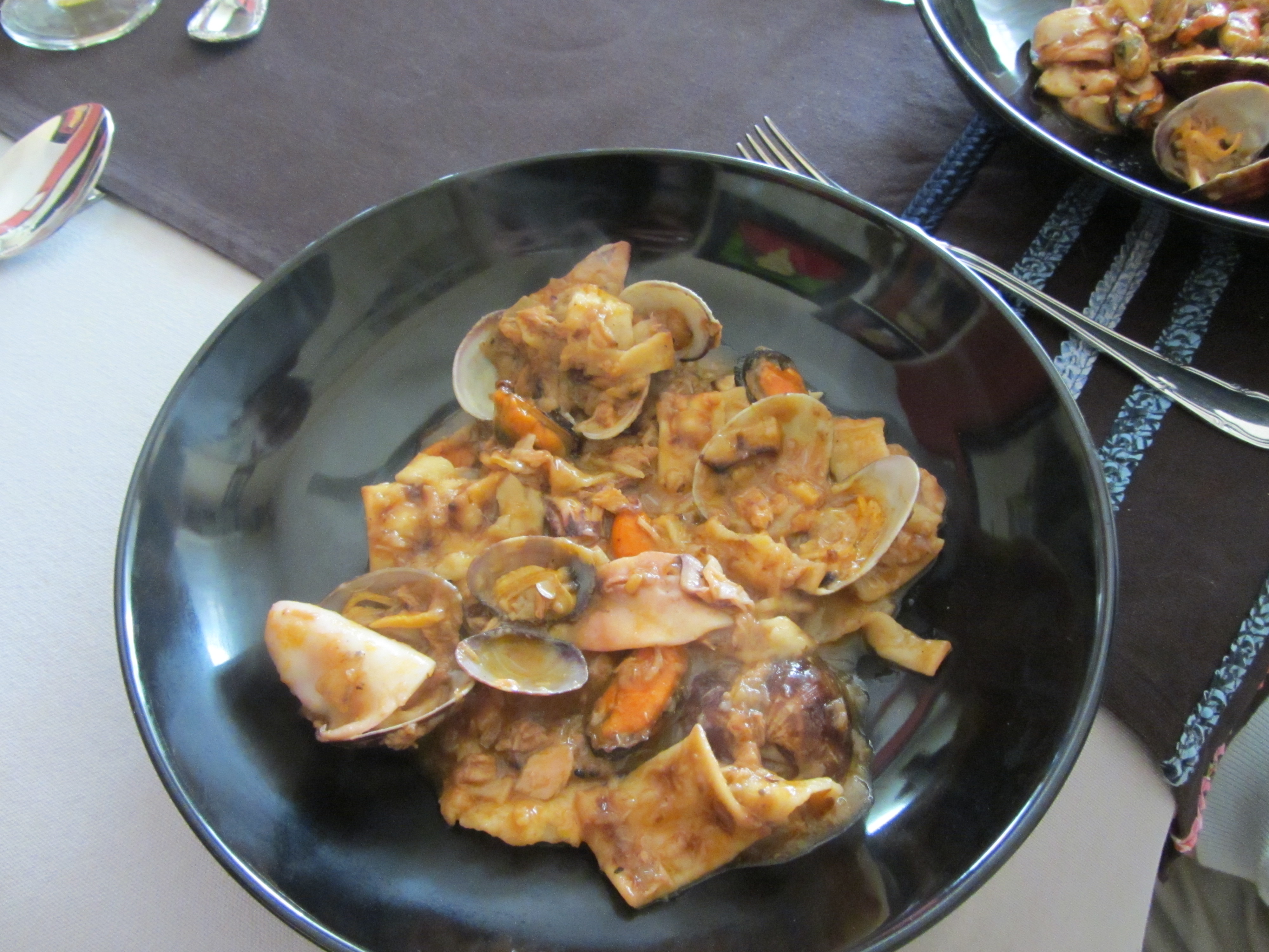 Hacemos el sofrito y reservamos. Abrimos los mejillones en una sartén y las almejas en otra; limpios y bien secos, pasamos por una sartén los calamares pequeños (muy poco, unos 4 minutos). En una cacerola ponemos el caldo de pescado, el sofrito y el caldo que hayan soltado los mejillones y las almejas. Cuando esté caliente, añadimos las tortas o la pasta; cuando le falte poco para que esté hecha, añadimos el pescado troceado, sin espinas y los calamares pequeños; por último las almejas y los mejillones sin sus valvas. No debe quedar muy caldoso. El resultado es espectacular y el sabor, delicioso.