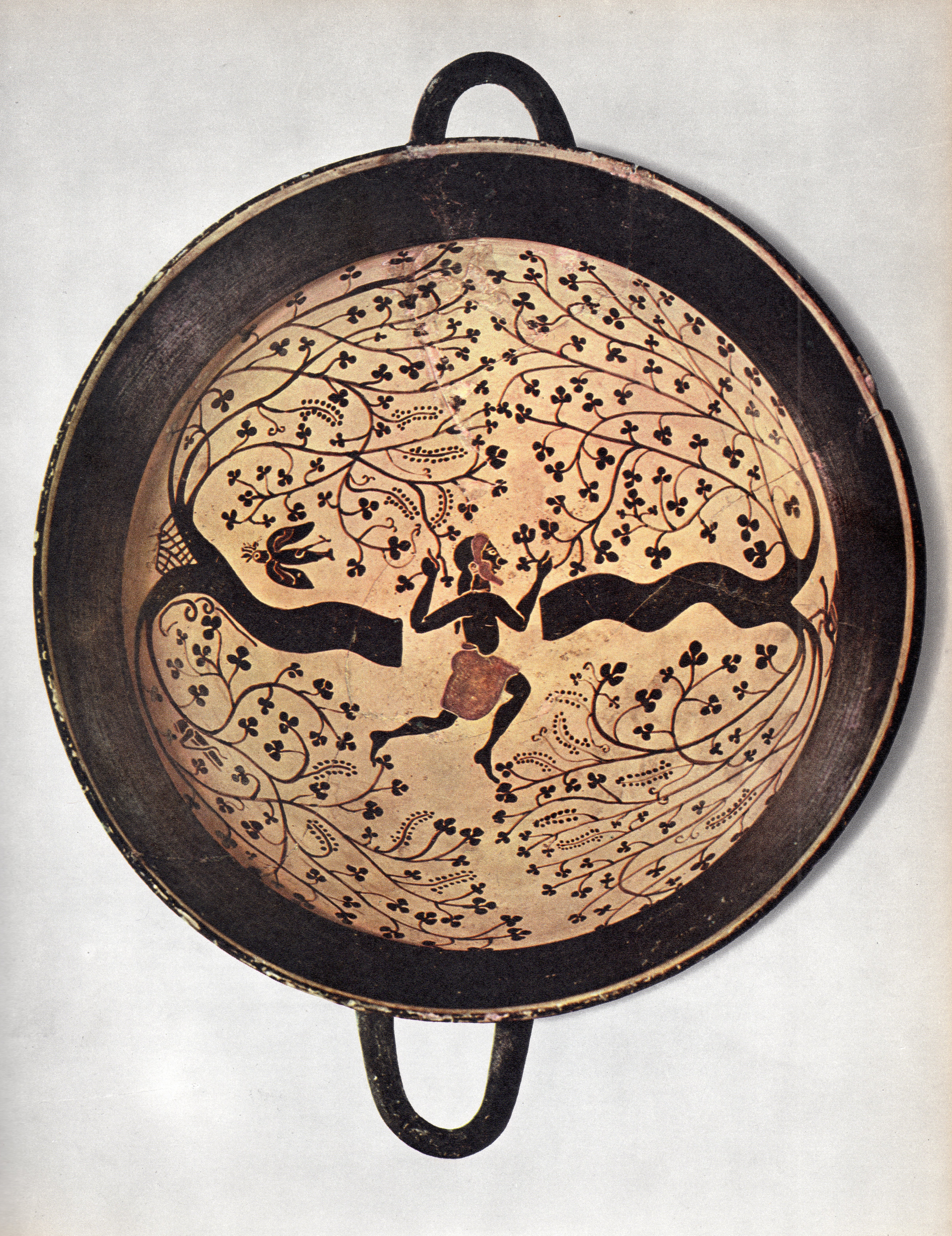 Bromas aparte, la copa de mediados del siglo VI realizada con la técnica de las figuras negras todavía indecisa, representa la figura de un hombre que sujeta las ramas flexibles de dos árboles, entre las cuales se puede ver un pájaro y a la izquierda, lo que parece un saltamontes.