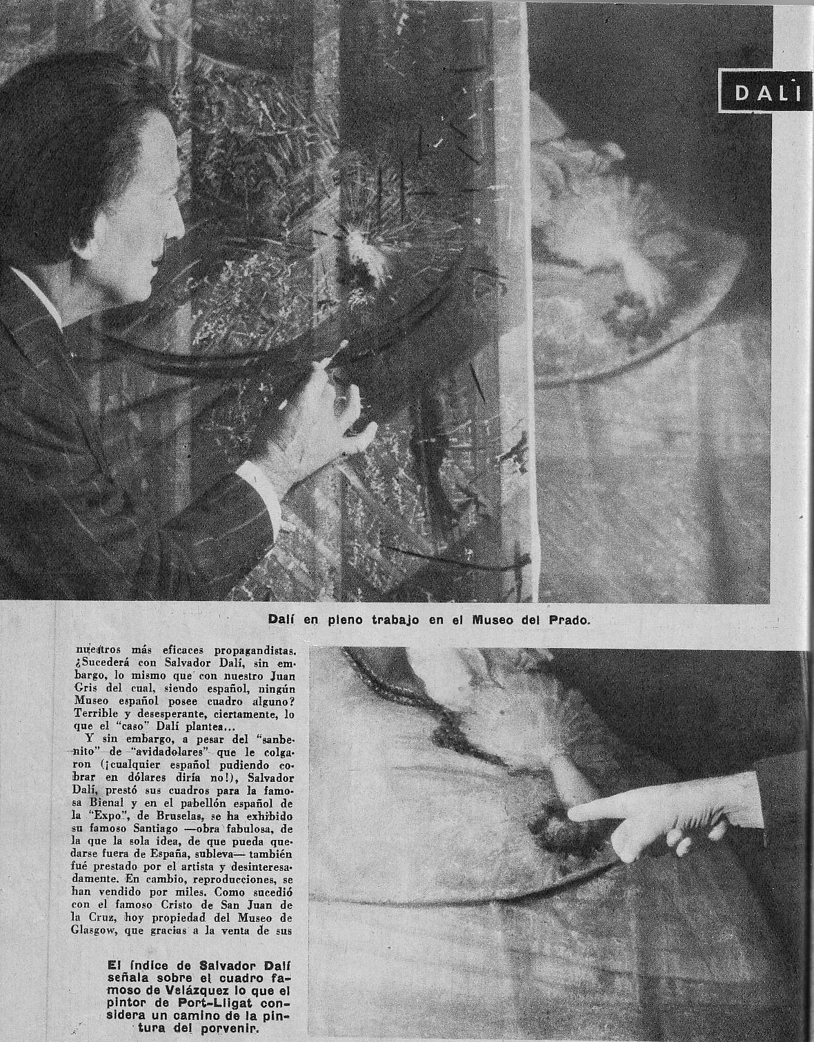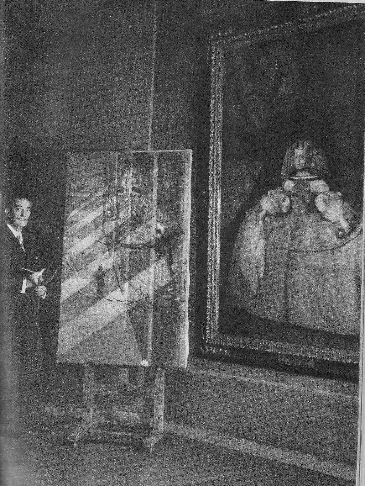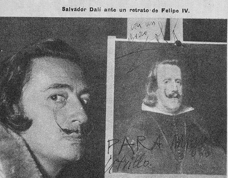 Salvador Dalí expresó en distintas ocasiones su admiración por Velázquez y por Vermeer. Por el estudio me he encontrado con estas fotos del pintor, en una visita que hizo con Gala al Museo del Prado, en la que está ante su versión y el original del retrato de la infanta Margarita de Velázquez, así como de su «pose» ante el retrato de Felipe IV luciendo ambos bigotes parecidos, posiblemente él los calificaría de «dalinianos». Curiosas fotos muy al estilo del genio ampurdanés. Son fotos antiguas, por ello su calidad, hoy, no es muy buena, aunque como testimonio son impagables. Las fotos fueron publicadas por la revista «Blanco y negro» en un artículo de Miguel Utrillo.