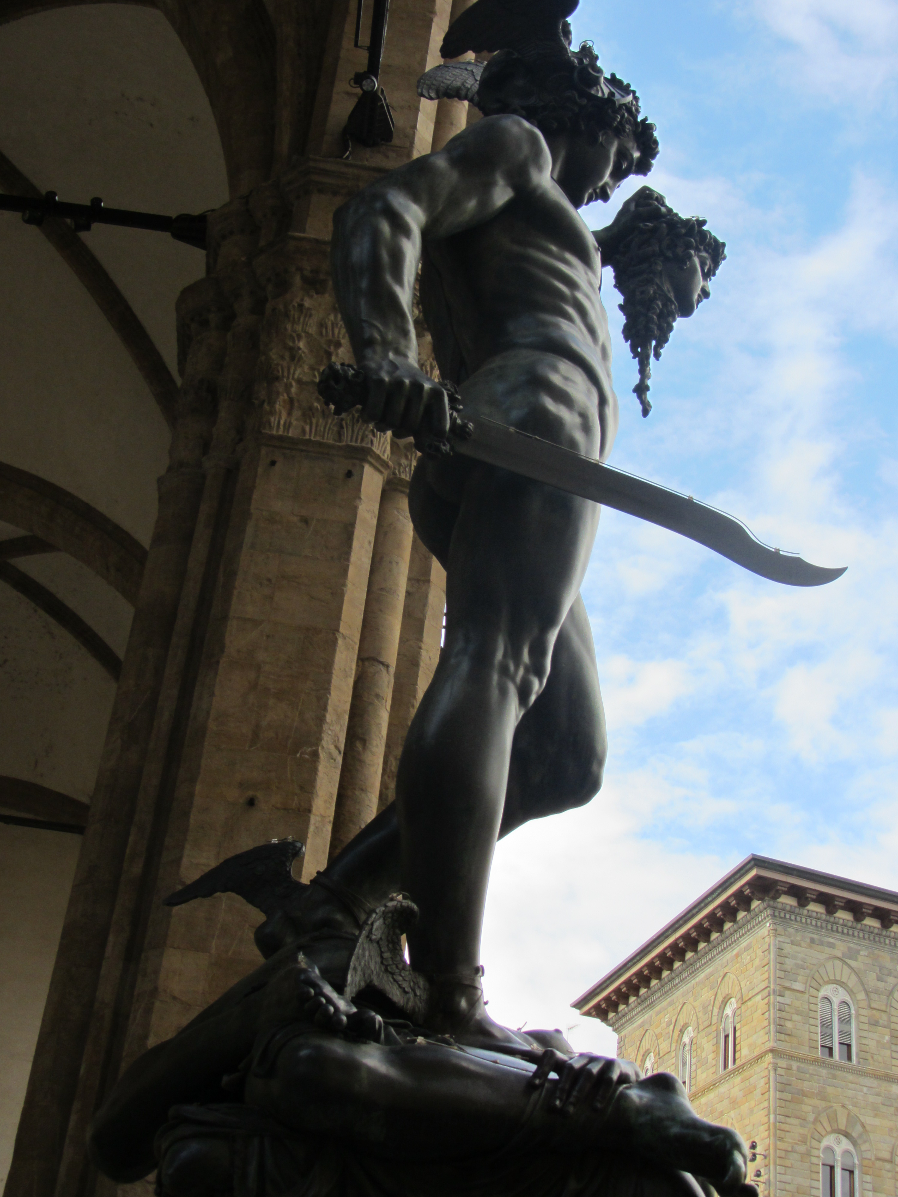 1. ¡Fantástico escorzo de Perseo, Bárbara! ¡Que brazos, que torso, que piernas! Hasta las rodillas están perfectas. ¿Y el detalle de las alas de los pies, y las melenas? Grandioso. Es una pena que no se pueda apreciar con más detalle la postura del cuerpo de Medusa yacida muerta y decapitada bajo los pies de Perseo, Debieran de poner un mini elevador al lado de la estatua para poder tener otras perspectivas enriquecedoras. ¡Cuánto que aprender!