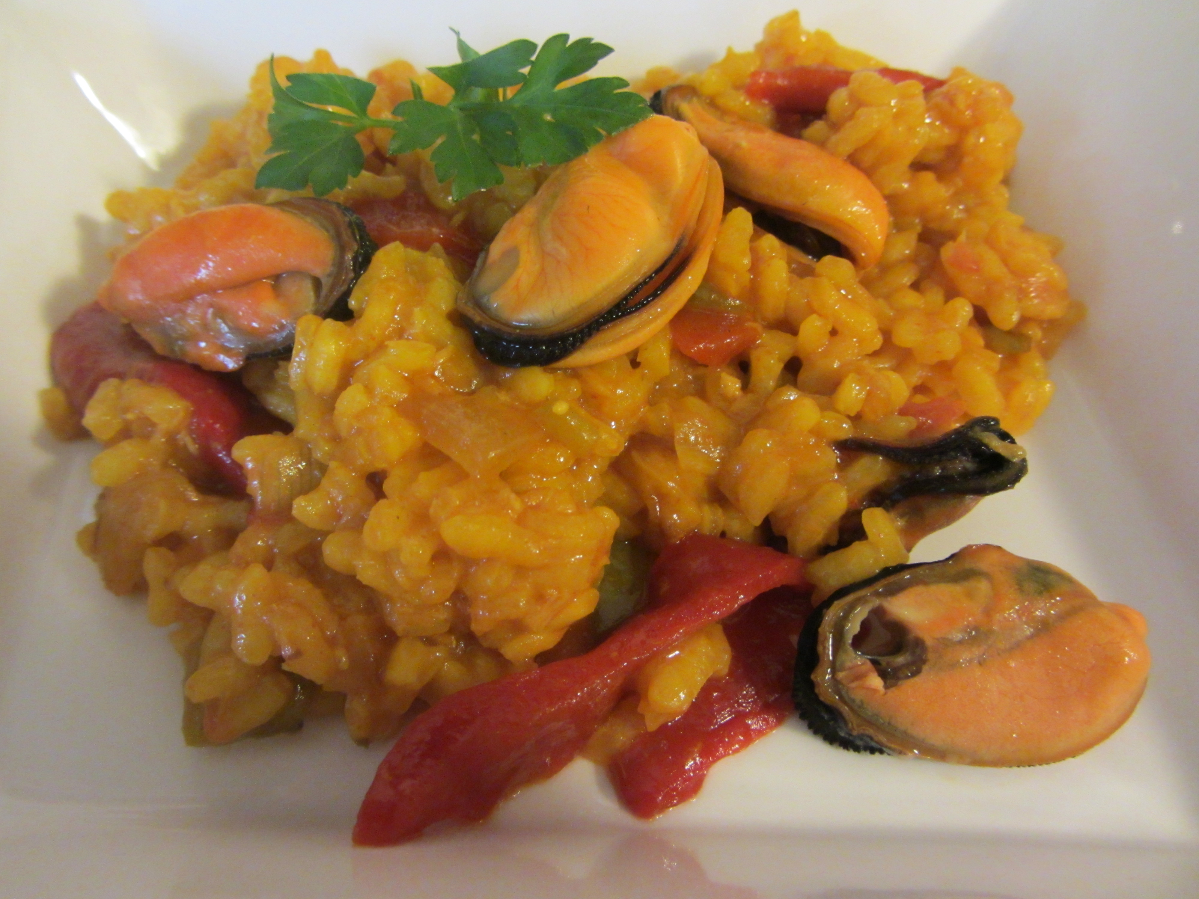 Ingredientes: 1 kg. de mejillones, caldo de pescado (casero o bien en brik), 1 cebolla, 1 cebolleta tierna, 1 pimiento italiano verde, 3 dientes de ajo, el arroz de grano redondo dependerá del número de los comensales, azafrán o colorante alimentario,  una cucharadita de cúrcuma,  1 cucharada de pimentón dulce y una lata de atún en aceite de oliva por cada 2 comensales, 3 cucharadas de salsa de tomate y pimientos morrones cortados en tiras.
