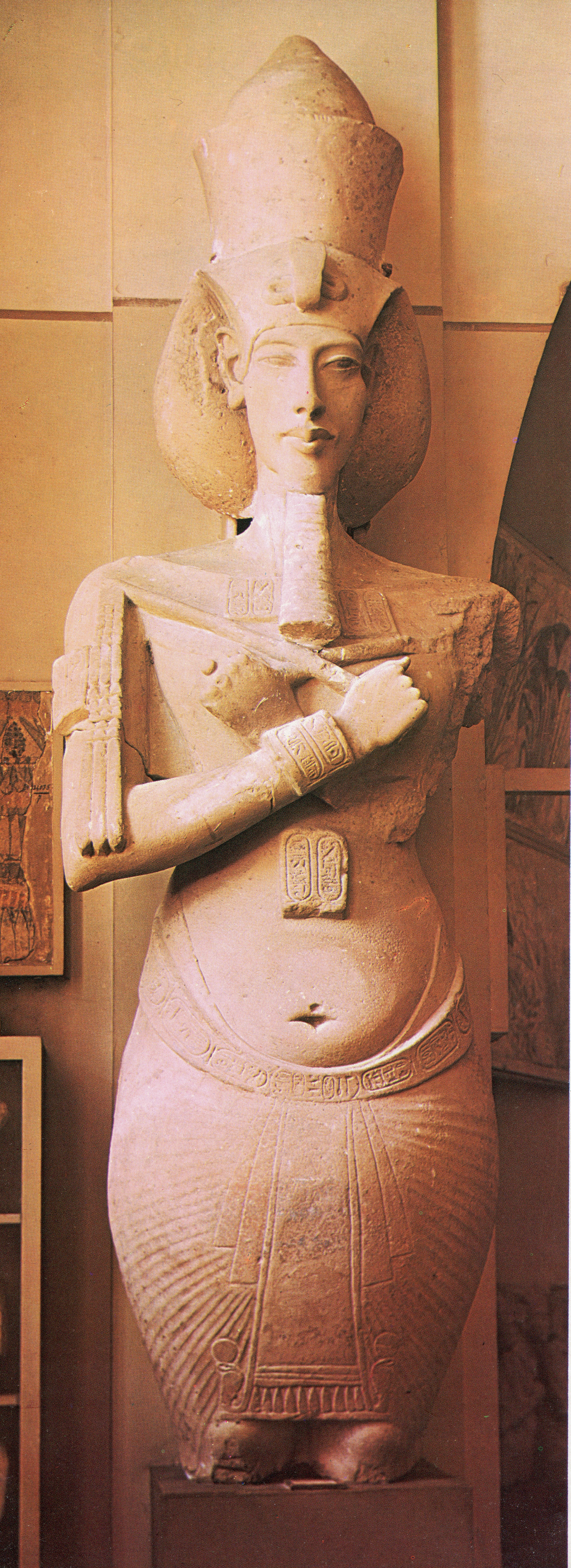 La escultura, debida a Bek, representa a Amenofis IV y se encuentra en el museo de El Cairo. Este faraón de la XVIII dinastía, nieto del gran Tuthmosis, fue el artífice de la gran revolución religiosa y estética que comenzó por sustituir Tebas, la hasta entonces capital del imperio, por la ciudad a la que hoy llamamos Tell-el-Amarna. Cambió su nombre por el de Akhenatón y la religión politeísta por otra monoteísta en la que el único dios es el disco solar Atón que con sus rayos propicia la vida y el crecimiento de todos los seres vivos. Al abandonar la idealización de las formas, los artistas se ciñeron a un realismo antes nunca visto; desconcierta el realismo que nos muestra a un faraón de hombros caídos, pecho hundido, con un cuello enorme, brazos muy delgados, piernas cortas y un vientre abultado… Su aspecto andrógino, lejos de los modelos atléticos o robustos anteriores, algunos lo atribuyen además al hecho de encarnar lo femenino y lo masculino.