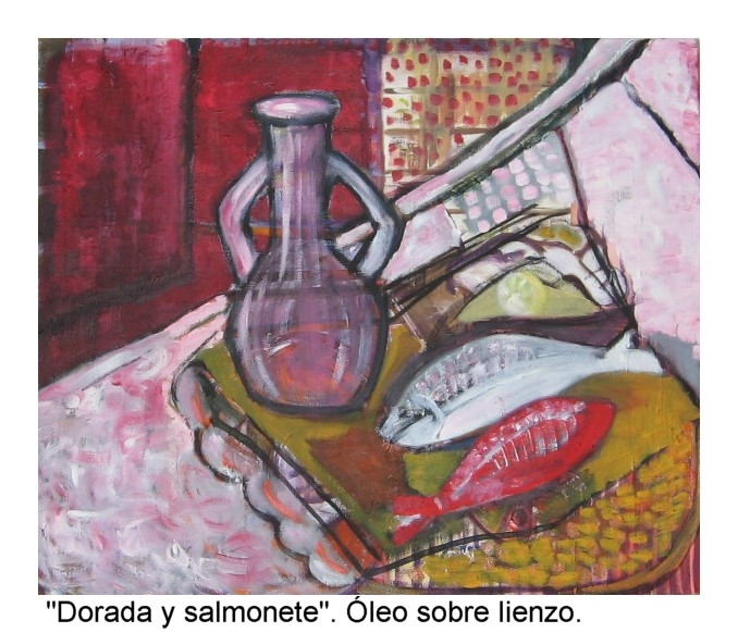No se trata de una receta sino de un bodegón que realicé en la década de los noventa con óleo sobre tela de lino. Me encantan todos los productos salidos del mar marinero; en este caso, como Juan Palomo, «yo me los guiso y yo me los como», y antes los pinto si tengo ganas; la jarrita es de las que yo llamo «chulas» por tener las asas en una postura de desafío, de actitud altanera…