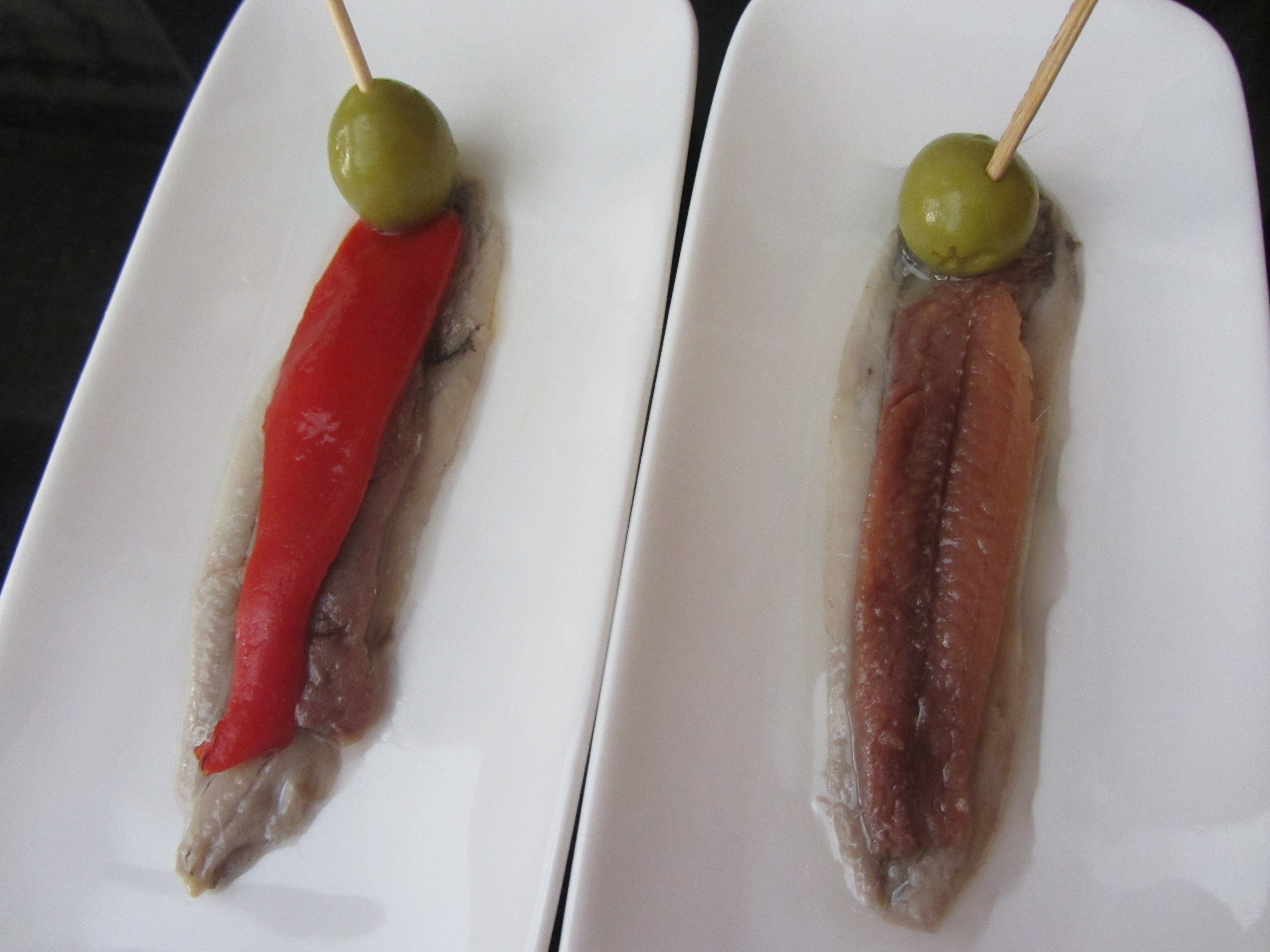 Hay matrimonios mal avenidos, pero estos, formados por un boquerón y una anchoa, se llevan la mar de bien. Esta es una tapa típica de Murcia que resulta muy refrescante, ideal para el aperitivo en los meses del verano. En las redes sociales se debate apasionadamente sobre una cuestión muy peliaguda: el boquerón se sitúa abajo y la anchoa encima o al revés. ¡Oh, qué dilema! Problema de difícil solución que entretiene y mucho… De derecha a izquierda, un matrimonio normal y otro con edredón… la aceituna es optativa, pero yo es que a todo le pongo la redonda, verde, jugosa fruta del olivo, tan española ella.