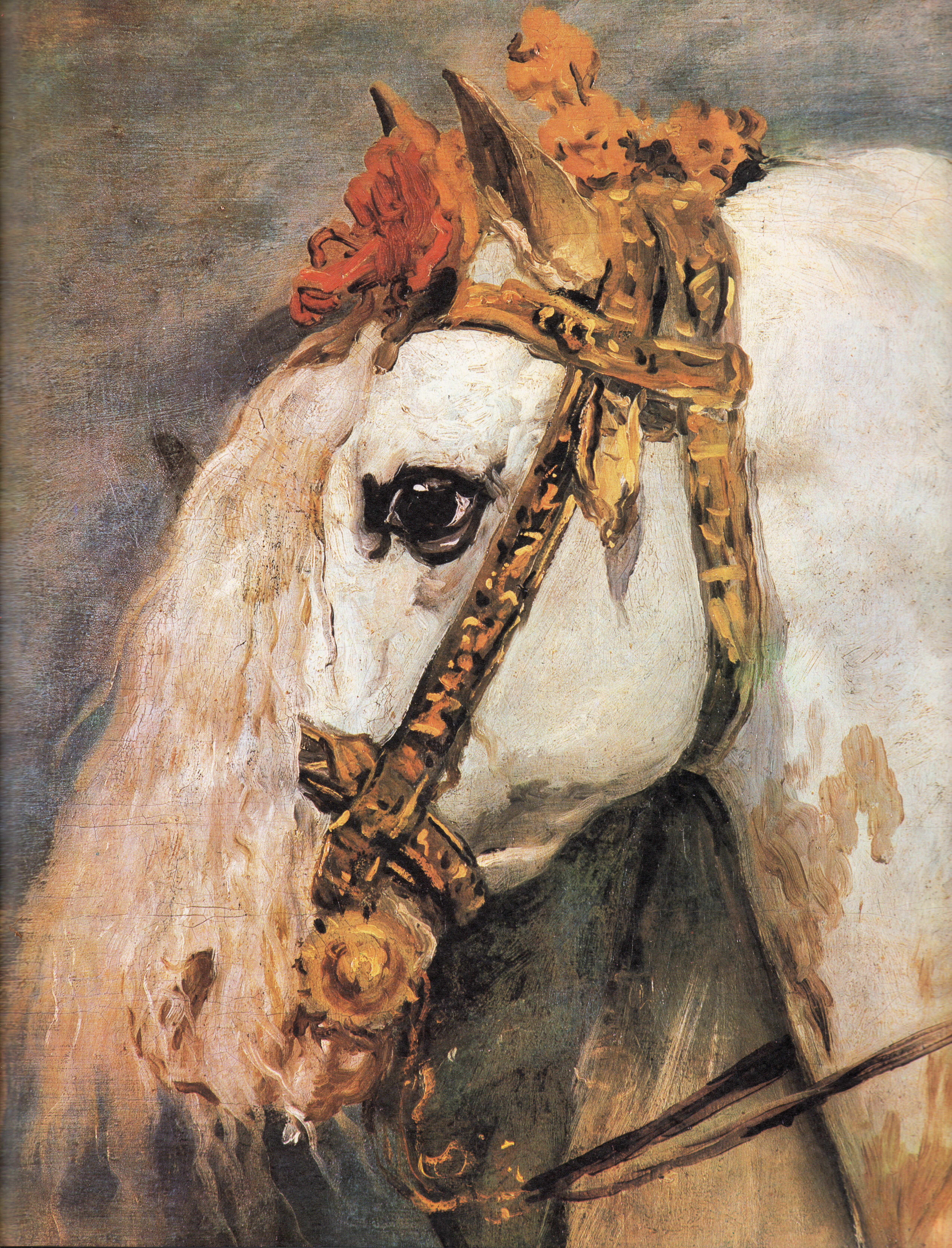 Esta soberbia cabeza del caballo pertenece al «Retrato ecuestre de Isabel de Borbón», esposa de Felipe IV, pintado por Velázquez (1634-1635). Los retratos ecuestres son retratos con empaque y monumentalidad; en los de Margarita de Austria y de Isabel de Borbón, grandes mantos y gualdrapas dejan ver solo la parte anterior de las cabalgaduras; en los de Felipe III y Felipe IV, en el del Conde-Duque de Olivares y también en el del Príncipe Baltasar Carlos los caballos parecen  encabritados, en movimiento, robustos, incluso potentes, rechonchos, debido, según algunos, a la altura en la cual iban a ser colgados; los de las dos parejas reales flanqueaban las puertas del Salón de Reinos; el del Príncipe Baltasar Carlos lo pinto para El Gran Salón del Palacio del Retiro. Estos retratos ecuestres fueron ampliados con tiras laterales añadidos al lienzo original.