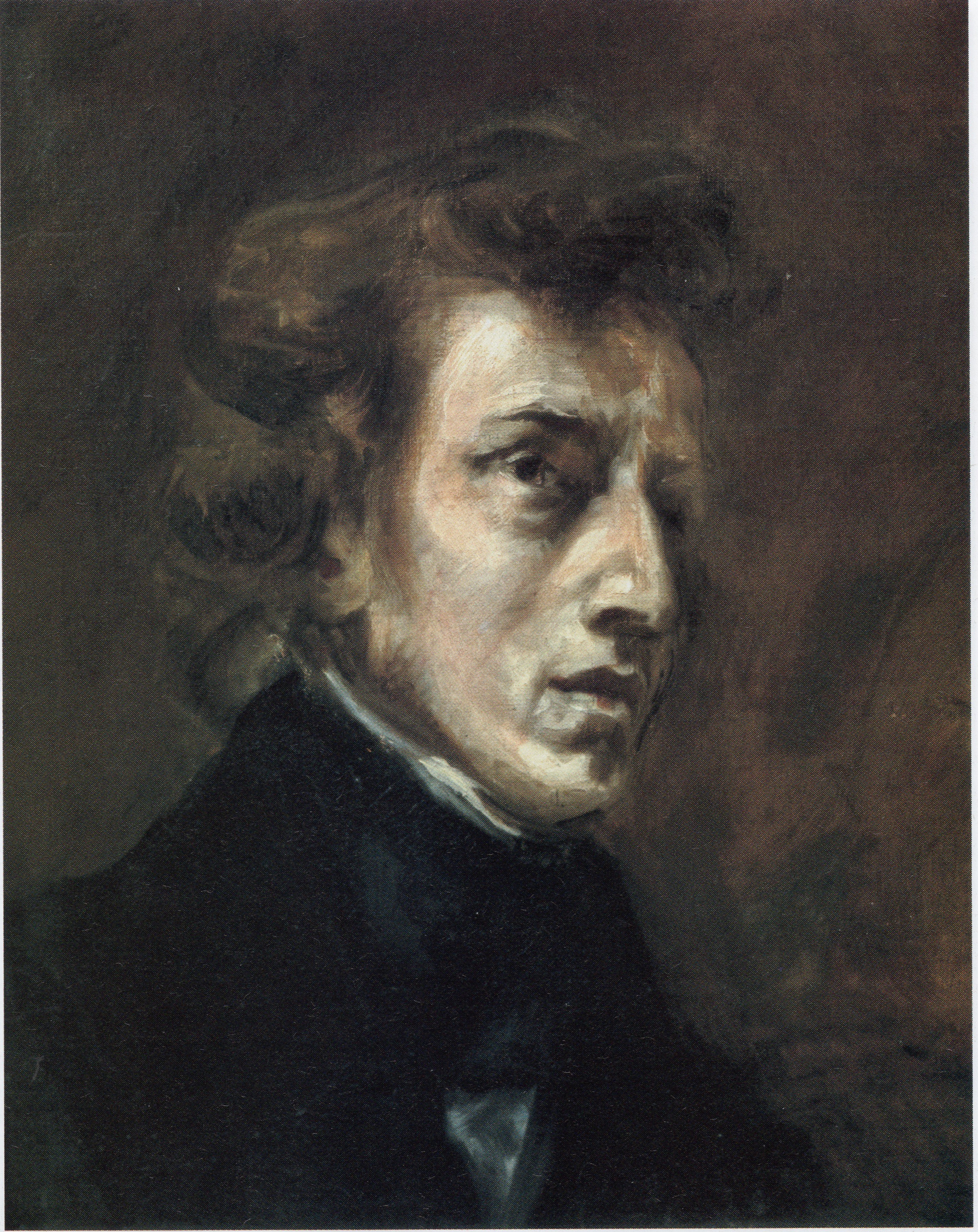 Delacroix, Chopin y George Sand, un pintor, un músico y una escritora fueron los protagonista de este retrato. El maestro Delacroix pintó pocos retratos, pero este influyó grandemente en los impresionistas. La amistad entre los tres se inicia en 1838, año en que se conocen; el genial músico polaco y su compañera, la escritora francesa, fueron la encarnación del espíritu romántico, su relación y sus vidas casi un alegato vivo. Cuando la amistad, el vínculo más noble, fuerte y desinteresado que pueda darse, une a esos tres seres fuera de lo común, lo hace para siempre, hasta la muerte del músico. Baste decir que en el estudio de Delacroix se instaló un piano para que Chopin pudiera tocar sus maravillosas improvisaciones, componer y deleitarlos; de igual manera la pareja tenía en su casa un taller para que el pintor, otro romántico declarado, pudiera trabajar a su antojo. Este cuadro tiene su historia; en un principio era un retrato de mayor tamaño en el que aparecían George Sand y Chopin separados por un piano, cuando se produce la ruptura entre ellos, el lienzo se cortó, separando físicamente a la pareja; la parte de la escritora se conserva en el Museo de Ordrugaard de Copenhague en Dinamarca.