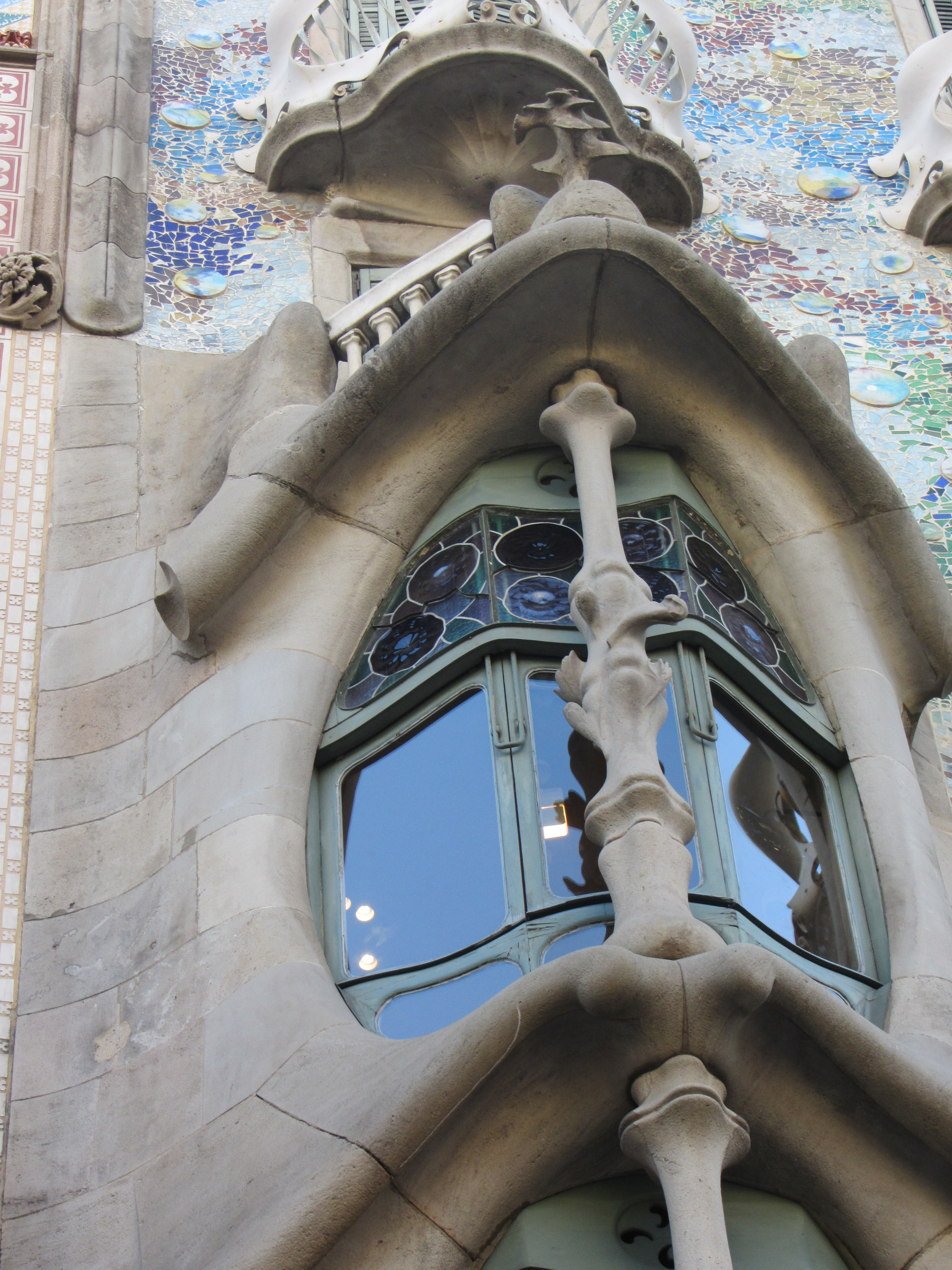 Una de las ventanas de la Casa Batlló, expresión fecunda del genio de Gaudí; las superiores son de menor tamaño por tener mayor luz natural. La fachada principal, situada en el Paseo de Gracia, es un conjunto de piedra y cristal con formas onduladas que revocó con mortero de cal y recubrió con trencadís de vidrios de colores y discos de cerámica. El salón principal de la parte noble tiene ventanas de madera que se abren con contrapesos lo que permite levantar todas las cristaleras para tener una visión panorámica. El tejado tiene forma de lomo de animal con grandes escamas tornasoladas. El mar, los elementos florales típicos del modernismo, no faltan en los detalles más mínimos, el mundo alegórico y orgánico de Gaudí se desarrolla como una gran ola; la total libertad que Don José Batlló dio al arquitecto hizo posible la espectacular y sorprendente obra; el dueño, un prestigioso hombre de negocios, quería una casa diferente y el genio de Gaudí transformó la materia en algo fabuloso que tiene respiración propia. Para conseguirlo se rodeó de los mejores artesanos de todos los gremios. La familia Batlló siguió viviendo en la casa hasta los años cincuenta, veinte años después del fallecimiento de Don José Batlló.