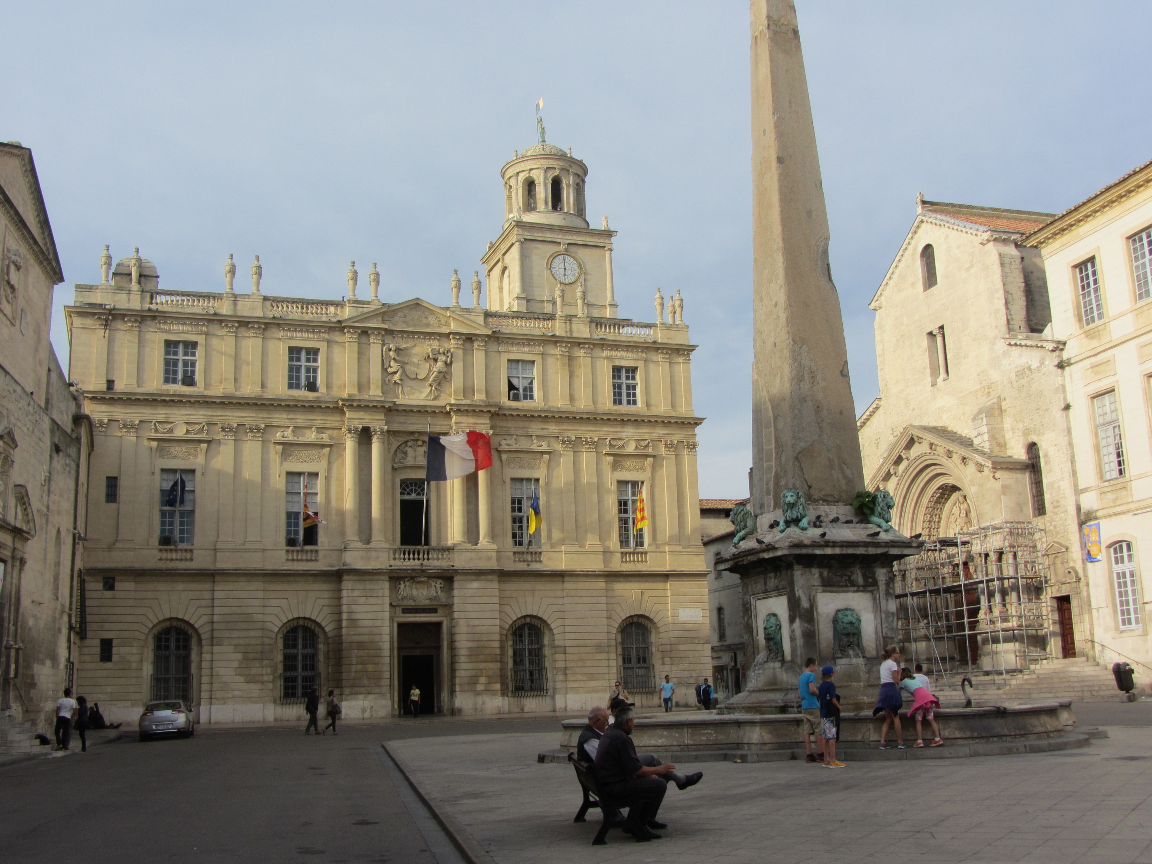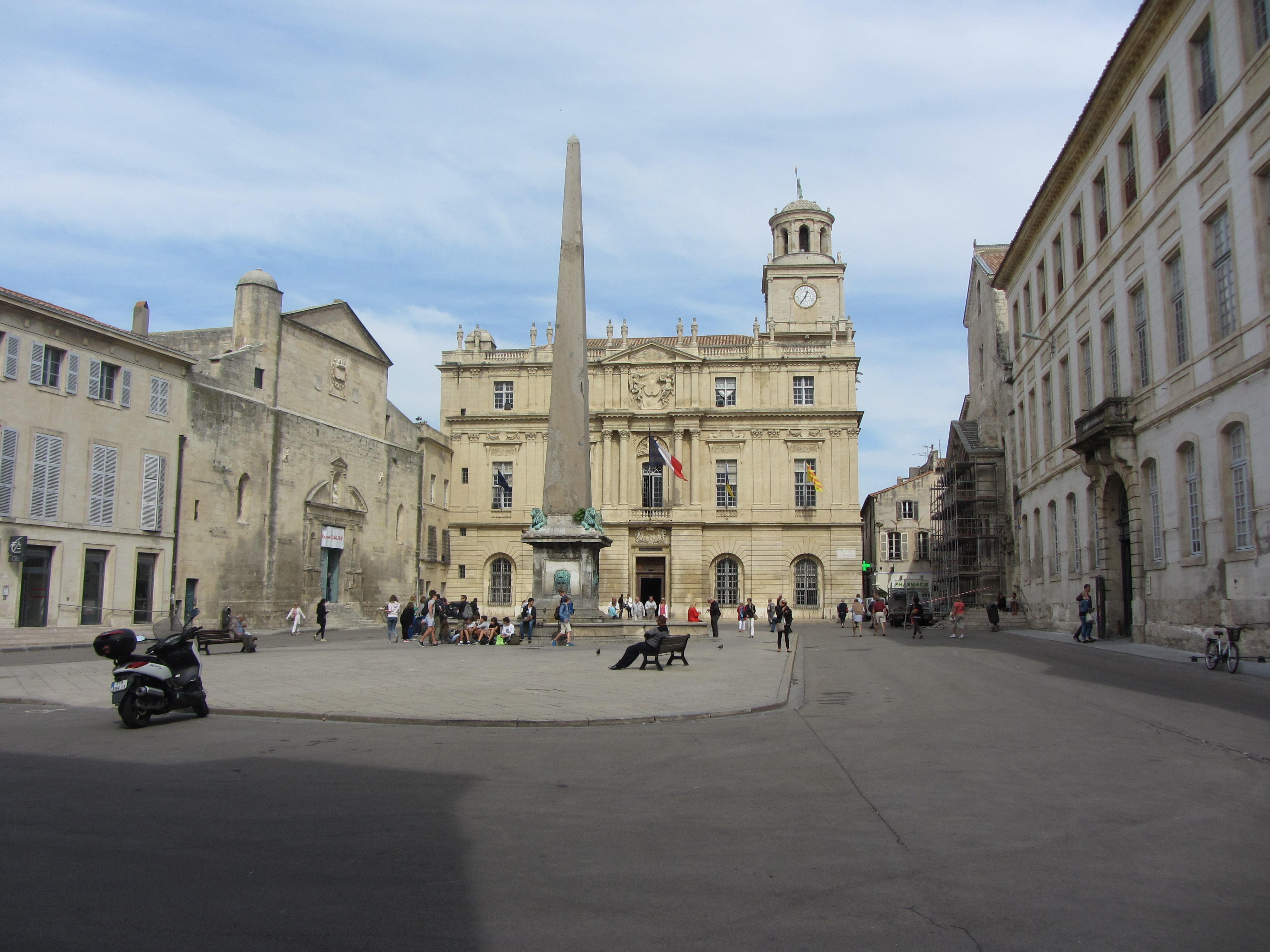 Desde l’Espace Van Gogh, tomando la rue Dulau, llegamos a la rue de la Republique para desembocar en la Place del mismo nombre, donde encontramos el Obelisco, el Ayuntamiento y Saint Trophime (¡¡¡cubierto su pórtico con andamios y el claustro cerrado!!!), Mi desolación fue completa; desde joven he llevado en mi mente la imagen del bellísimo exponente del románico provenzal, ese pórtico del Juicio Final. Cuando lo vi por primera vez en 2008 estaba limpio y lavado por la lluvia, y era tan hermoso…