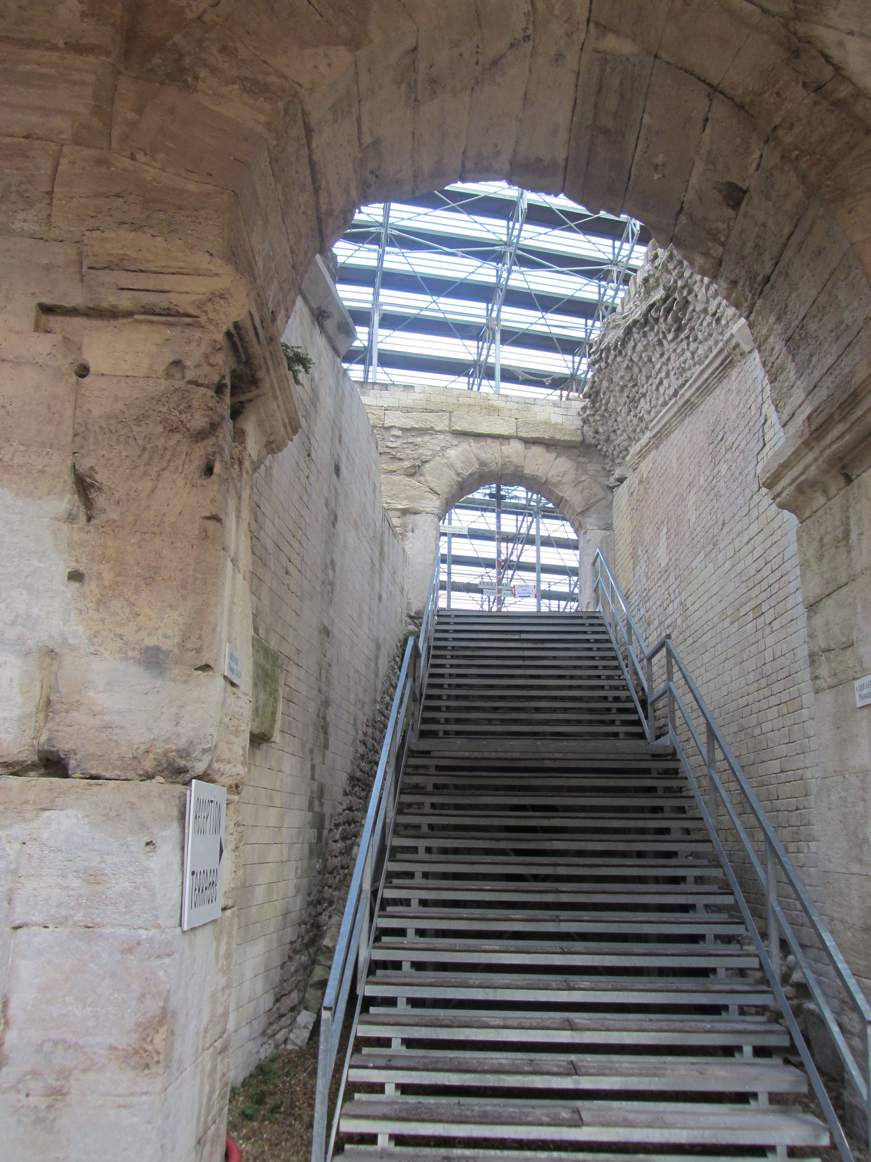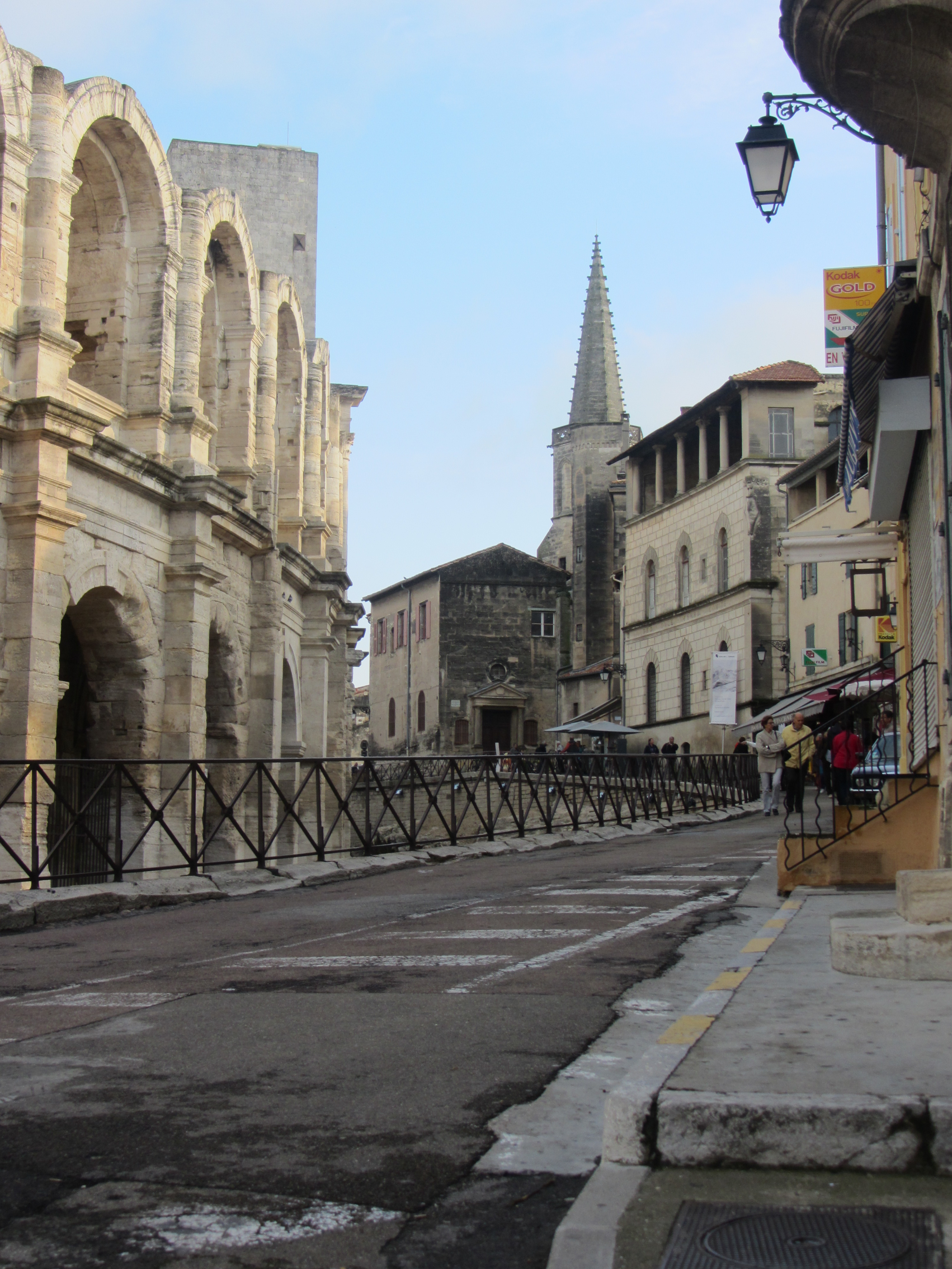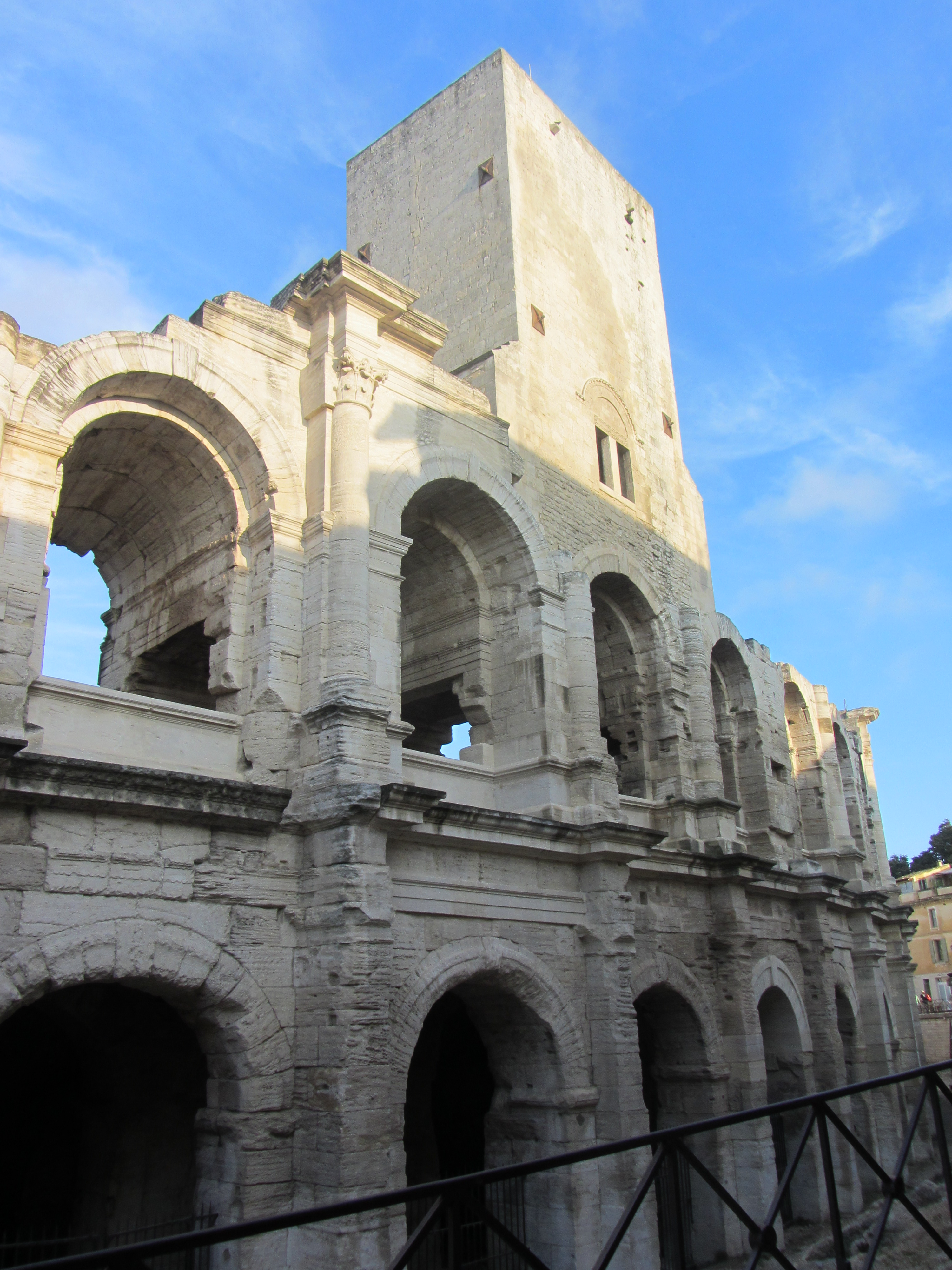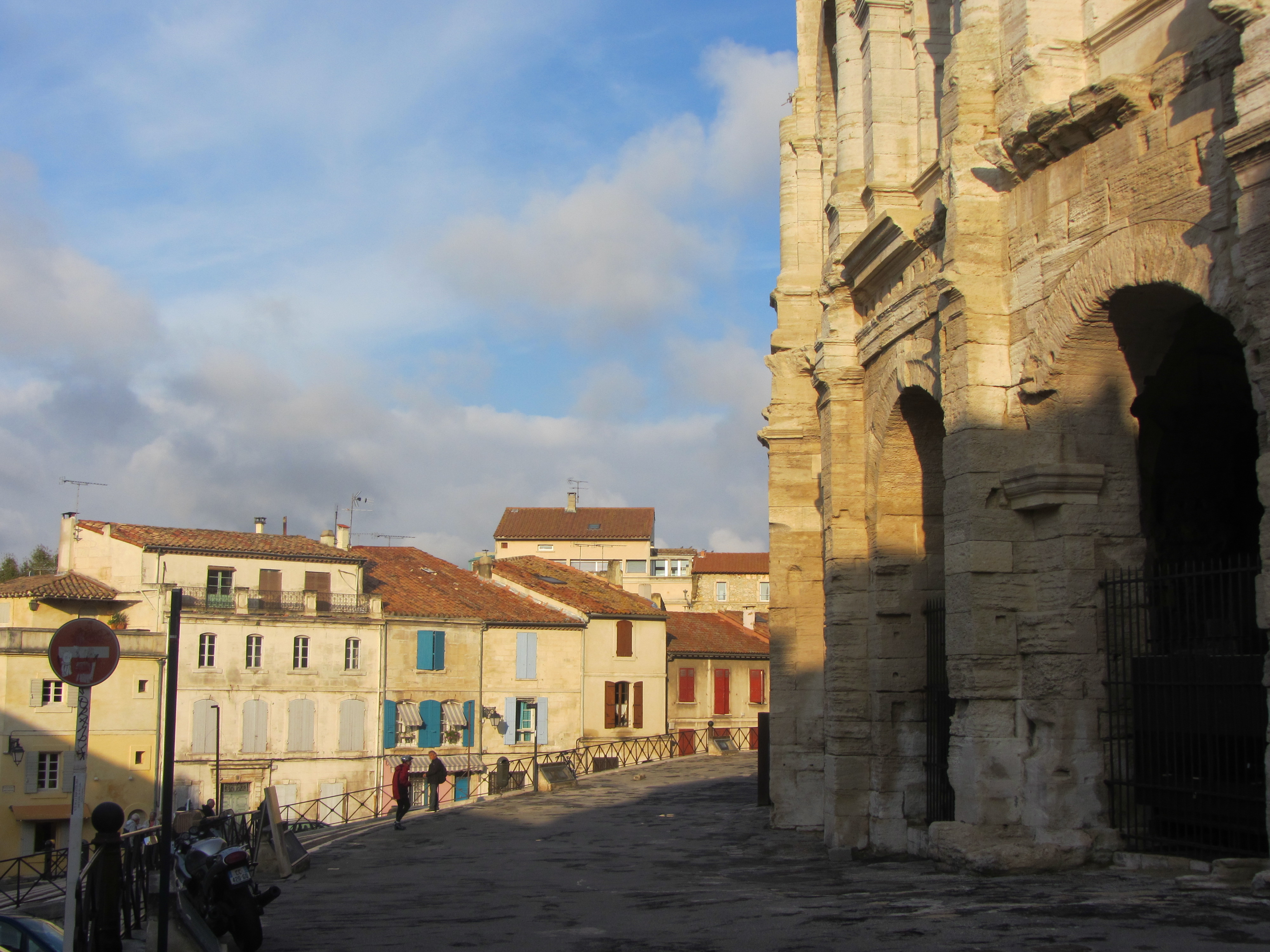 Arles, Arelate («el hábitat cerca de las marismas»), la  antigua ciudad romana, se asienta sobre una colina, siendo el Forum la parte baja, allí donde nos habíamos quedado; volvemos sobre nuestros pasos hasta encontrarnos de nuevo en la parte de atrás del Ayuntamiento. Desde ahí vamos a tomar la rue de la Calade, que trepa hasta lo alto. De pronto el sol, como si se aliara a nuestro favor, comienza a dorar las piedras del Téâtre Antique que aparece a la derecha, soberbio desde el siglo I a. C. encerrado entre rejas, pero es el imponente Amphitéâtre, a la izquierda, lo que, envuelto en la luz dorada de la tarde, nos transporta a otra época.