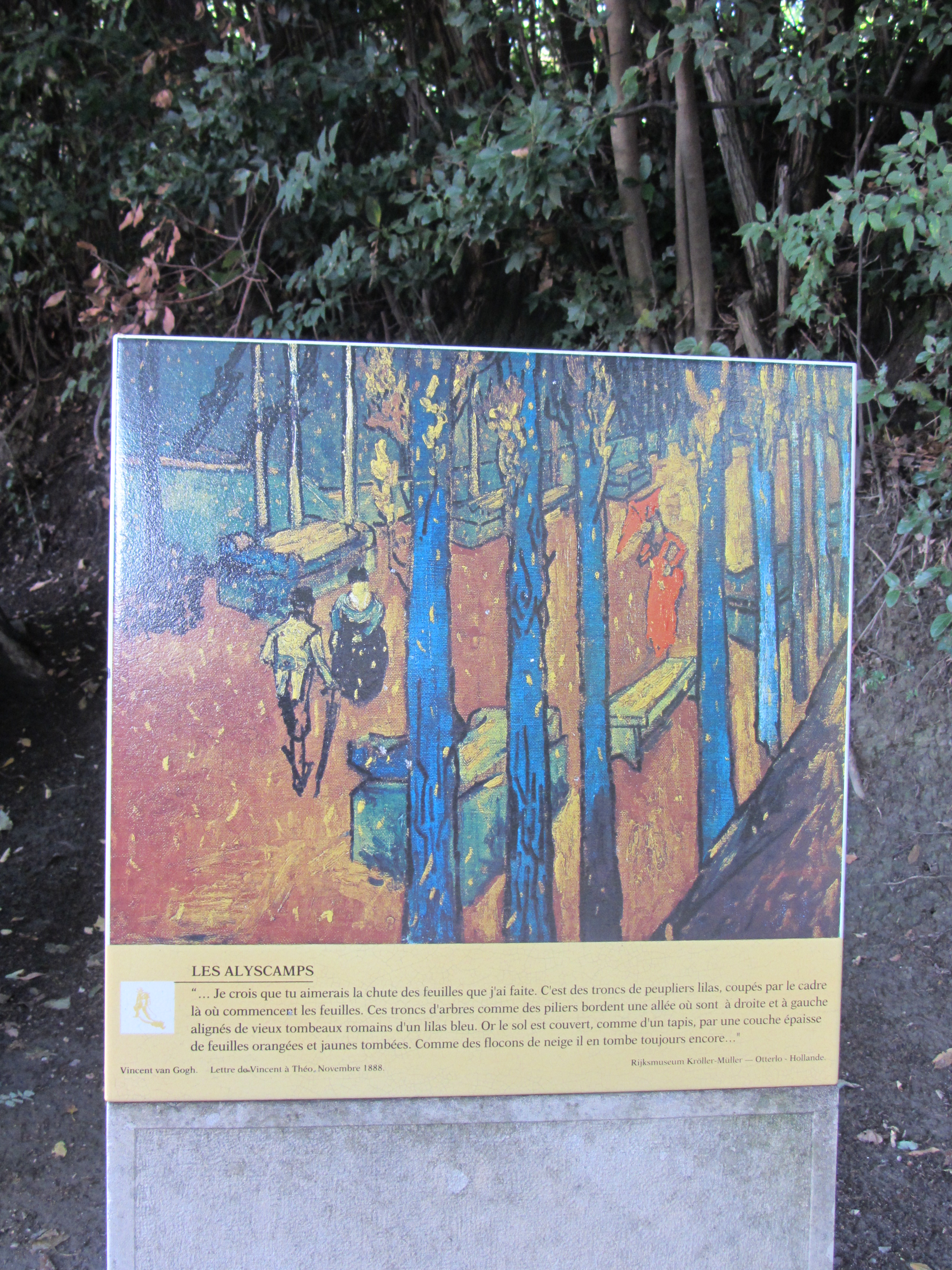 En noviembre de 1888, tal como pone en la cartela, Vincent escribe a su hermano Theo describiendo la avenida de los Alyscams tal como la ve y siente. Este lugar, entonces igual que hoy, era un lugar donde las familias iban a pasear, los niños a jugar y a disfrutar los días en los que el sol se filtraba por entre las hojas de los álamos de gruesos troncos; aquí plantaba el caballete para que se vieran además los sarcófagos en hilera… También Gauguin pinta los Alyscamps a su manera para mostrarle a su amigo como se debía pintar… Sin comentario.