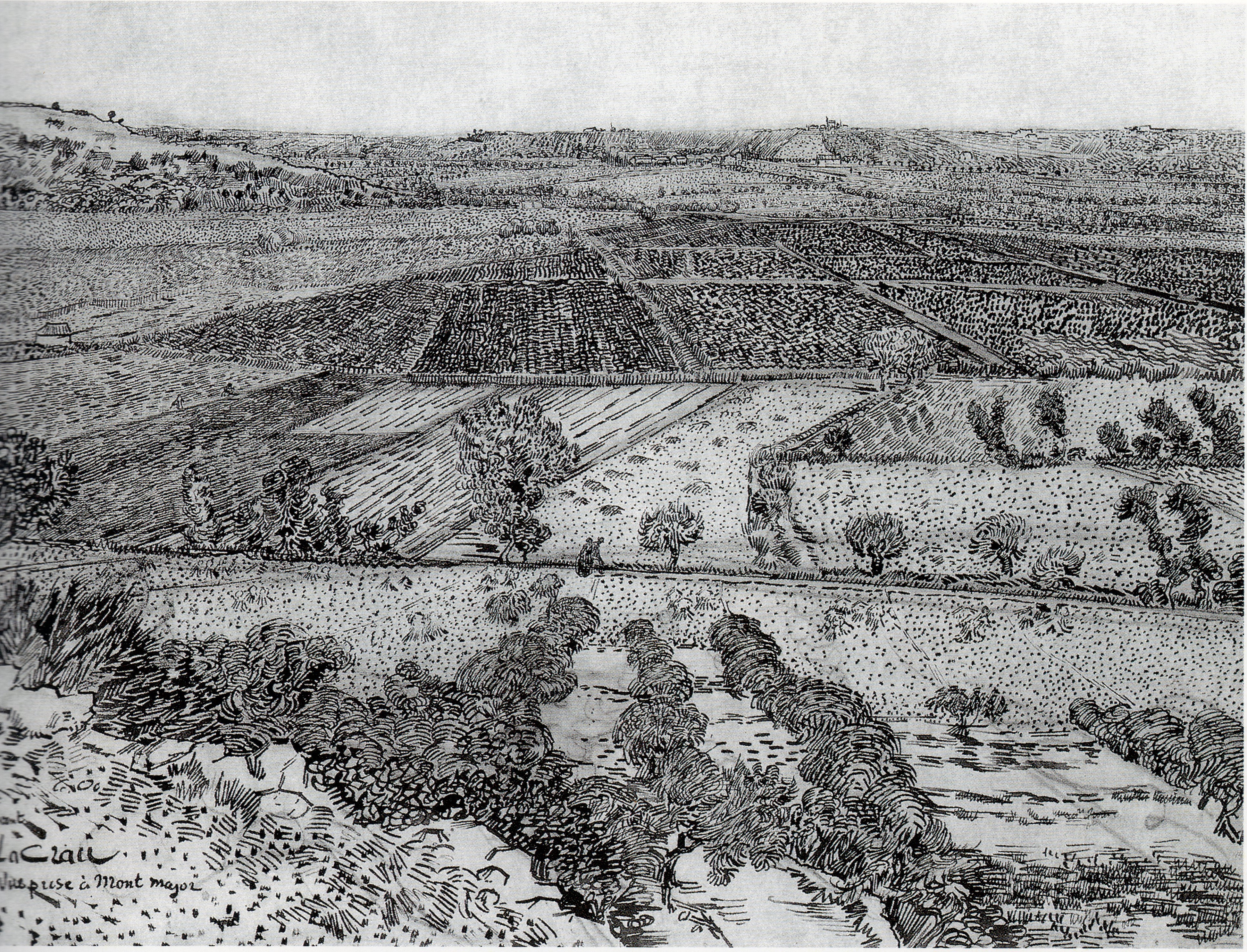 Dibujado también en julio de 1888 está realizado con los mismos elementos e igualmente pertenece a la Fundación Vincent Van Gogh. Esta vista de la llanura de la Crau está con toda probabilidad realizada desde las rocas del dibujo de arriba.