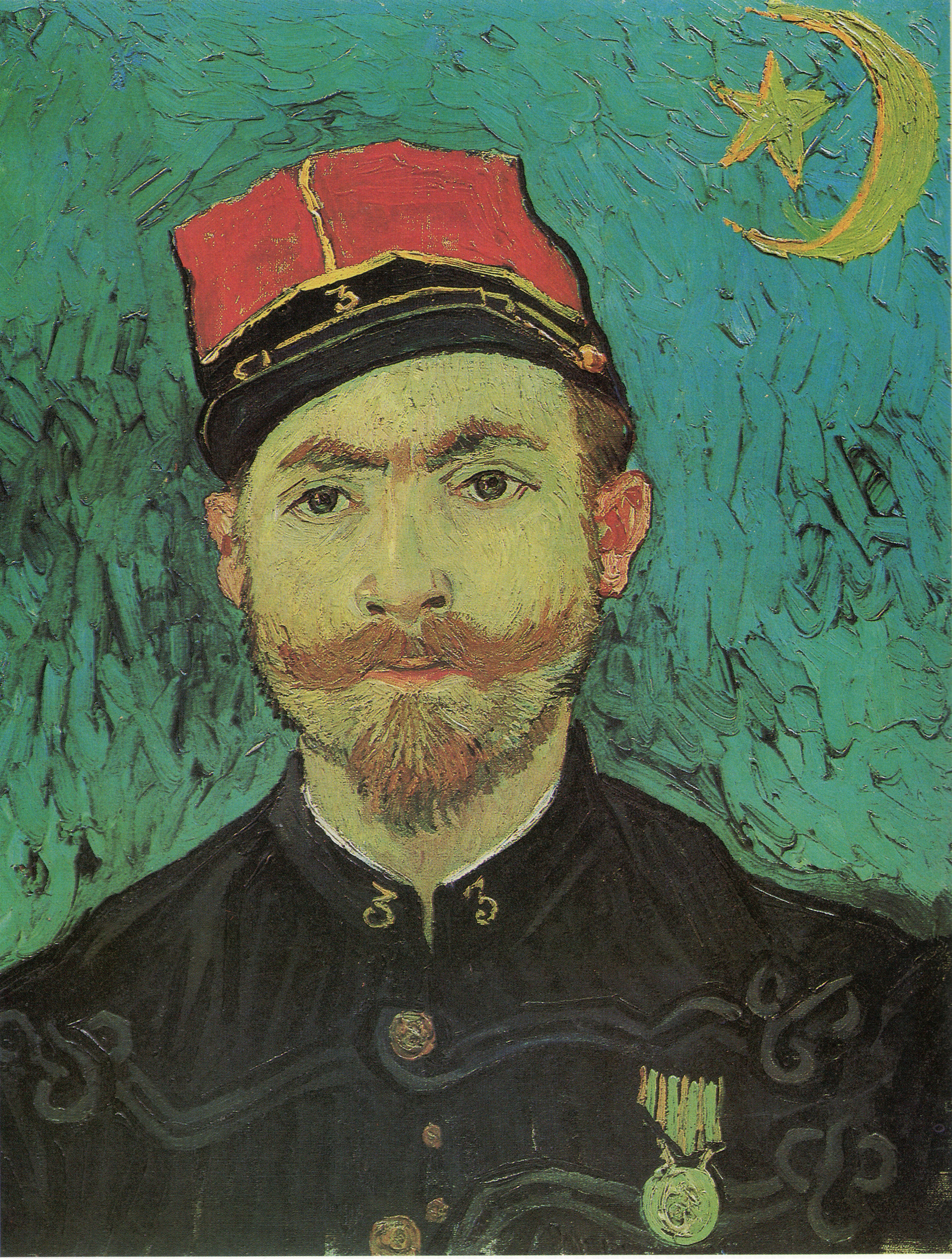 El retrato de su amigo lo realizó al final de septiembre de 1888 (óleo sobre tela, 60 X 49) Otterlo, Rijksmuseum Kröller-Müller. En el fondo a la derecha se destaca en amarillo la estrella y la media luna de la compañía argelina de los Zuavos. Un dato anecdótico, el padre  de Albert Camus servía en la compañía de los Zuavos y murió muy joven en el frente en suelo francés.