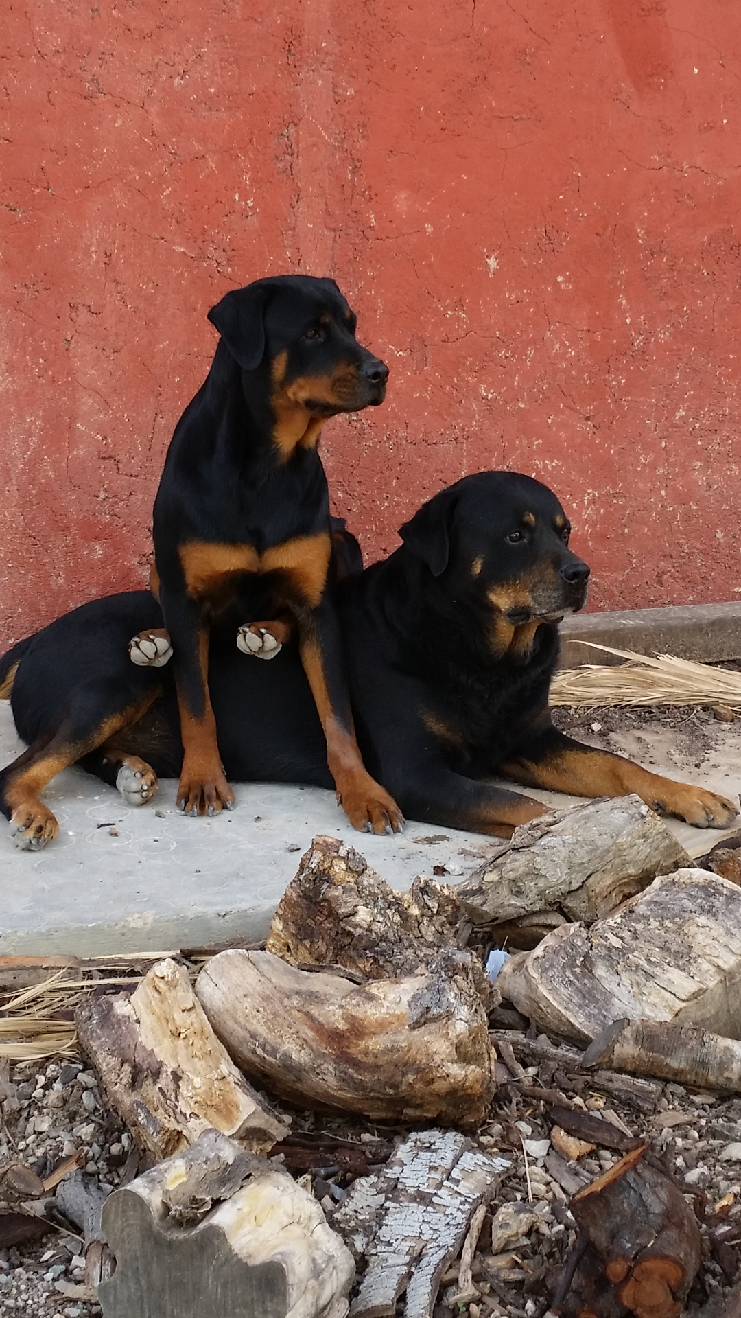 Esta pareja perfecta de Rotweilers, Retaco y Enana, tan bien avenida toman el sol de esta manera tan particular; sobre el lomo de Retaco se sienta ella, como la cosa más natural del mundo. Si serena es la mirada de él, la de ella deja traslucir una gran satisfacción. Al otro lado de la finca, Mari Pili cacarea de satisfacción. ¿Qué tendrá este lugar para que los animales sean tan felices, aparte de sus envidiables condiciones de vida? La respuesta es así de sencilla: un propietario que para mí debió nacer en Asís y ser como Francisco… no digo ni más ni menos!