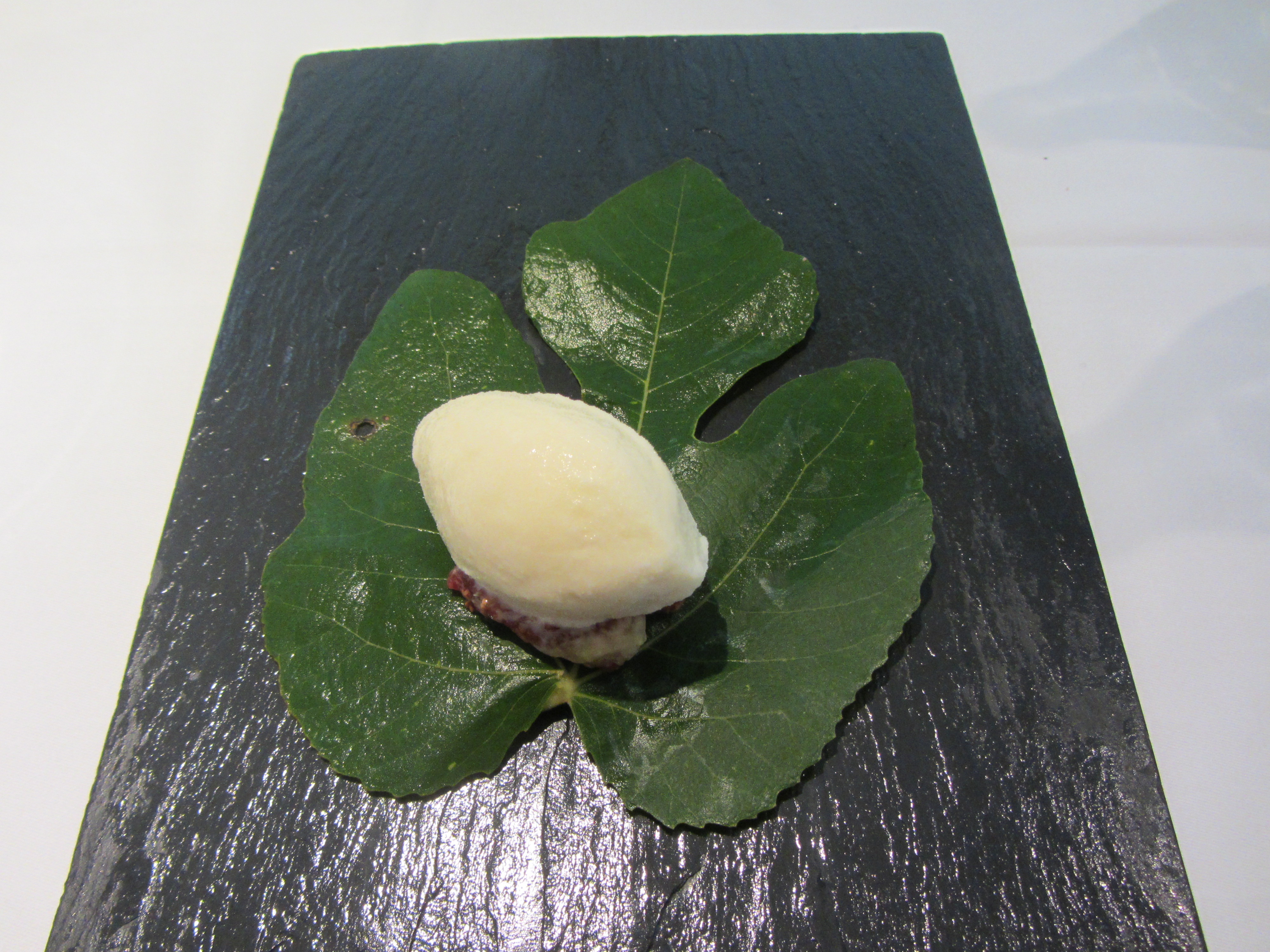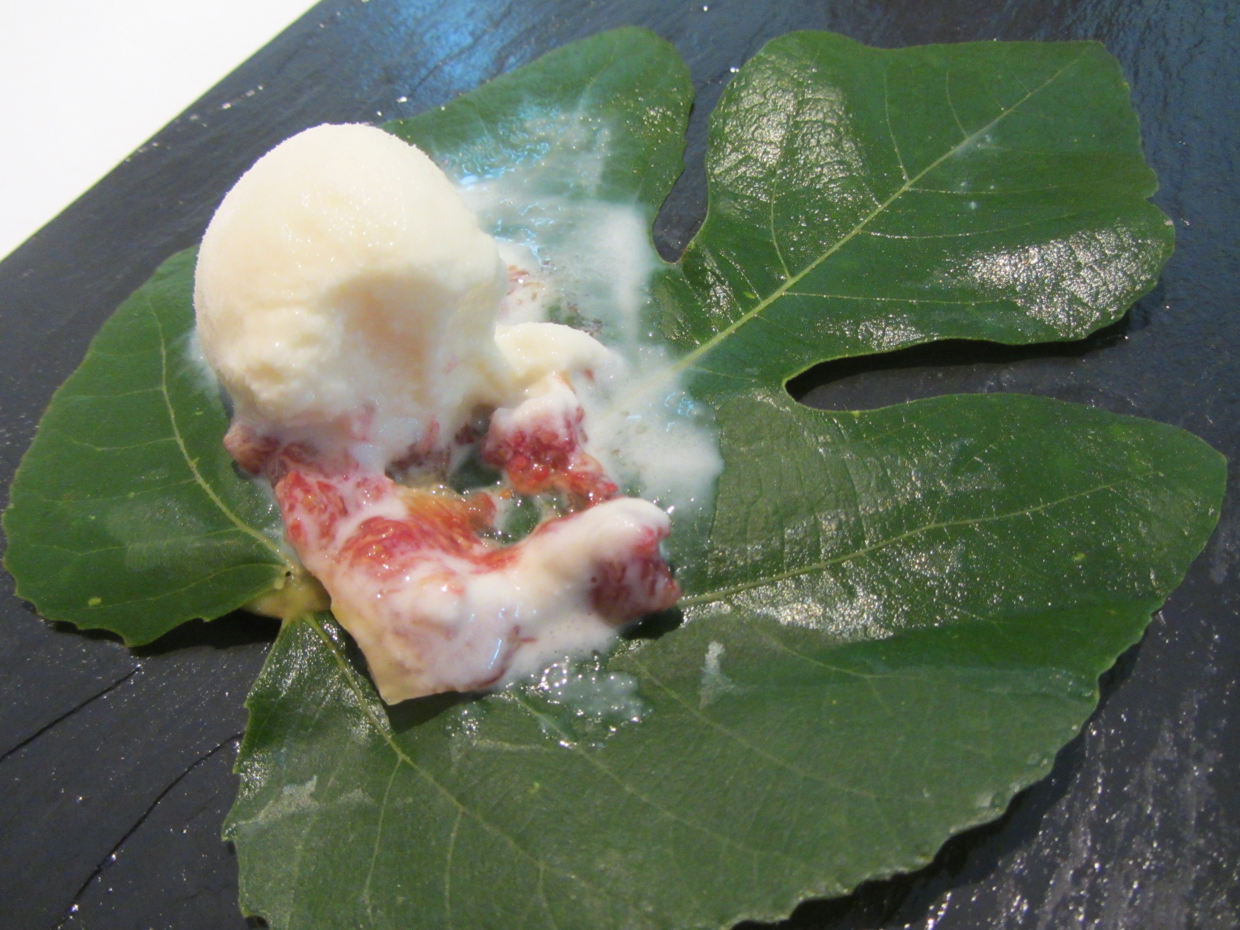 Sobre una hoja de parra, una base de higo fresco rematado con helado de coco; la combinación es realmente exquisita, dulce sin empalagar, como un sorbete refrescante.