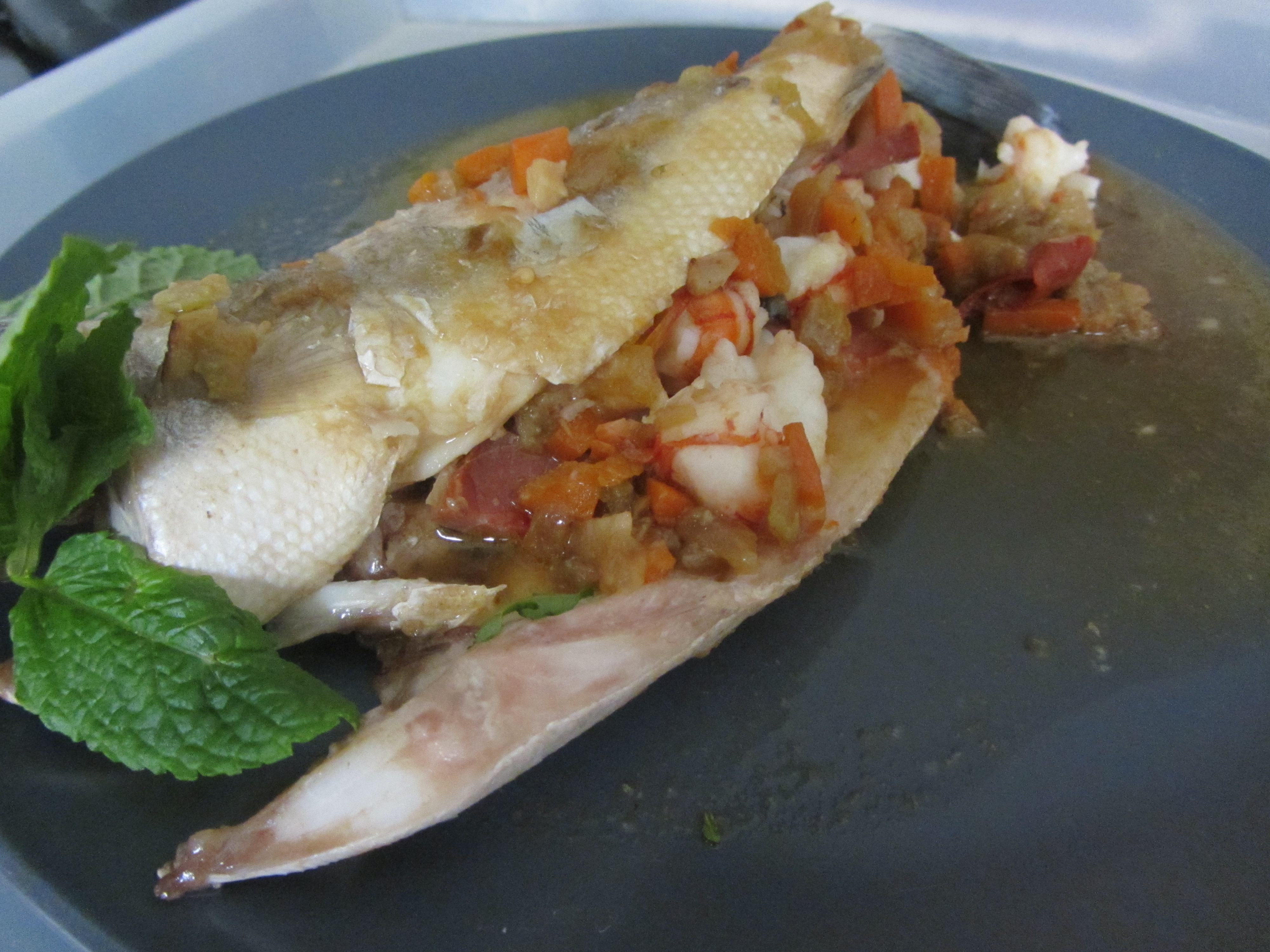 Las lubinas, sin espina central y bien limpias, las rellenamos con rodajas de lomo embuchado (se puede sustituir por jamón serrano, pero queda demasiado salado para mi gusto) y trozos de gambón o de cualquier otro marisco. Laminamos los ajos, troceamos la parte blanca y la verde de las cebolletas y rehogamos en una sartén con un poco de aceite de oliva; agregamos las zanahorias cortadas en brunois y rehogamos; finalmente añadimos tres cucharadas de salsa de tomate, la cúrcuma, unas hojas de laurel y salpimentamos. Incorporamos finalmente el vino blanco y al poco el fumet y la mostaza. Dejamos unos cinco minutos al fuego. Colocamos, en una bandeja para el horno, las lubinas rellenas y vertemos por encima la salsa. Metemos en el horno precalentado a 220 grados y horneamos lo justo, unos 15 minutos.