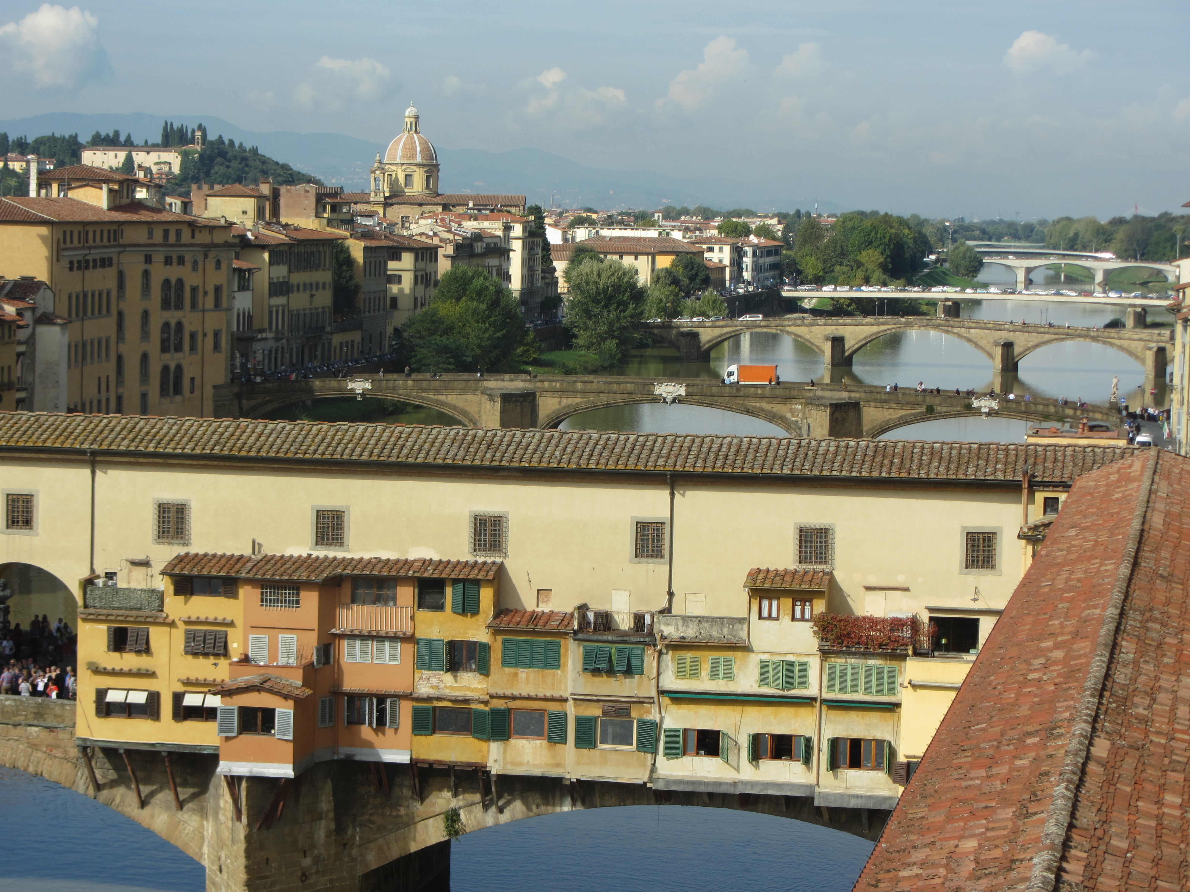 Cuando el Ponte Vecchio está mas bonito es al atardecer visto desde el Ponte Santa Trinità o desde cualquiera de las orillas; cuando hice las fotos era a mediodía de un día claro y luminoso y puedo asegurar que se veía hermoso. El puente medieval de tres arcos descansa en dos fuertes pilares con forma de proa de barco; fue construido en 1345 siendo el más antiguo de Florencia; y, menos mal, se salvo de los bombardeos durante la II Guerra Mundial. Siempre ha habido talleres y comercios a lo largo del puente, sobre todo de joyería y orfebrería, pero inicialmente había carnicerías, herrerías y curtidores que contaminaban el río; algunos de los talleres medievales más antiguos tienen pequeñas ampliaciones que dan al río siendo sostenidas por puntales de madera llamados sporti.