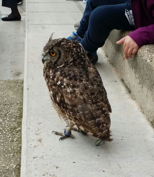 Un búho anillado en una grada observa, ajeno, atentamente a las personas que lo rodean; no se inmuta, impasible. No sé lo que llama su atención, pero los ojos de estas aves parecen taladrar aquello que miran.