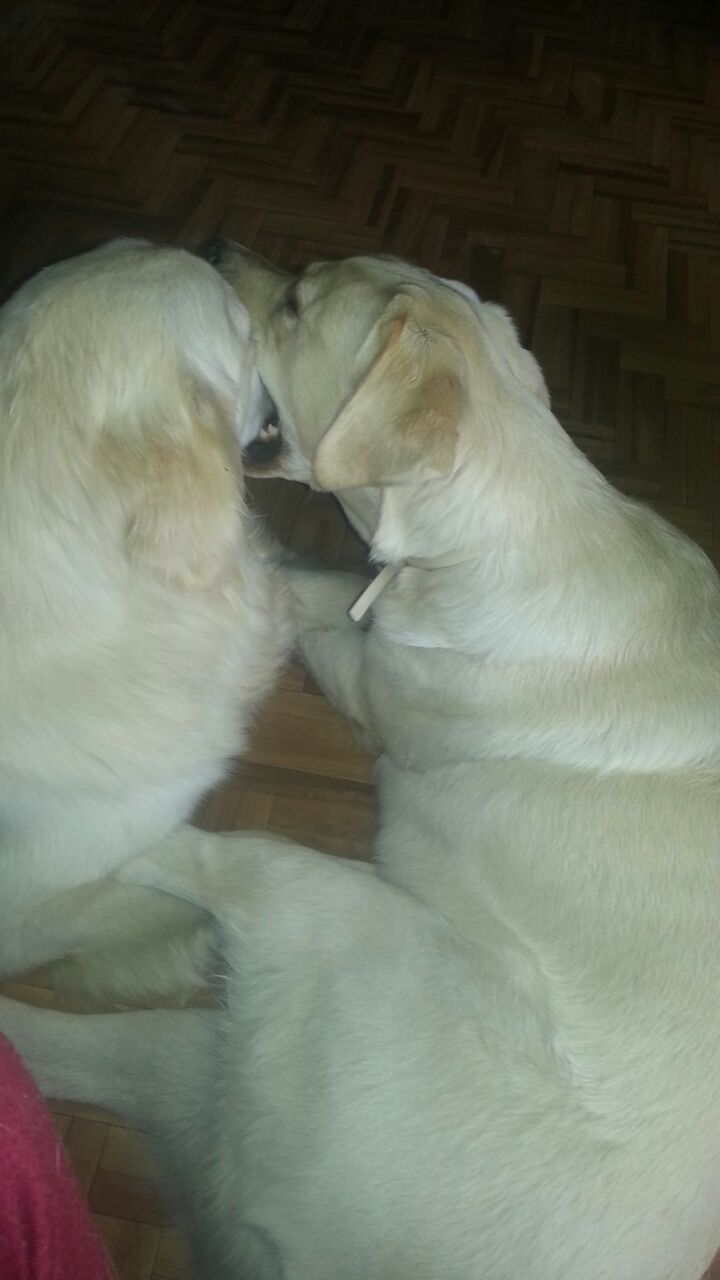 Oso y Duna, un golden retriever y una labrador retriever, se han vuelto inseparables, no paran de jugar y de hacerse carantoñas; a eso le llamo yo un «mordisquillo  cariñoso».