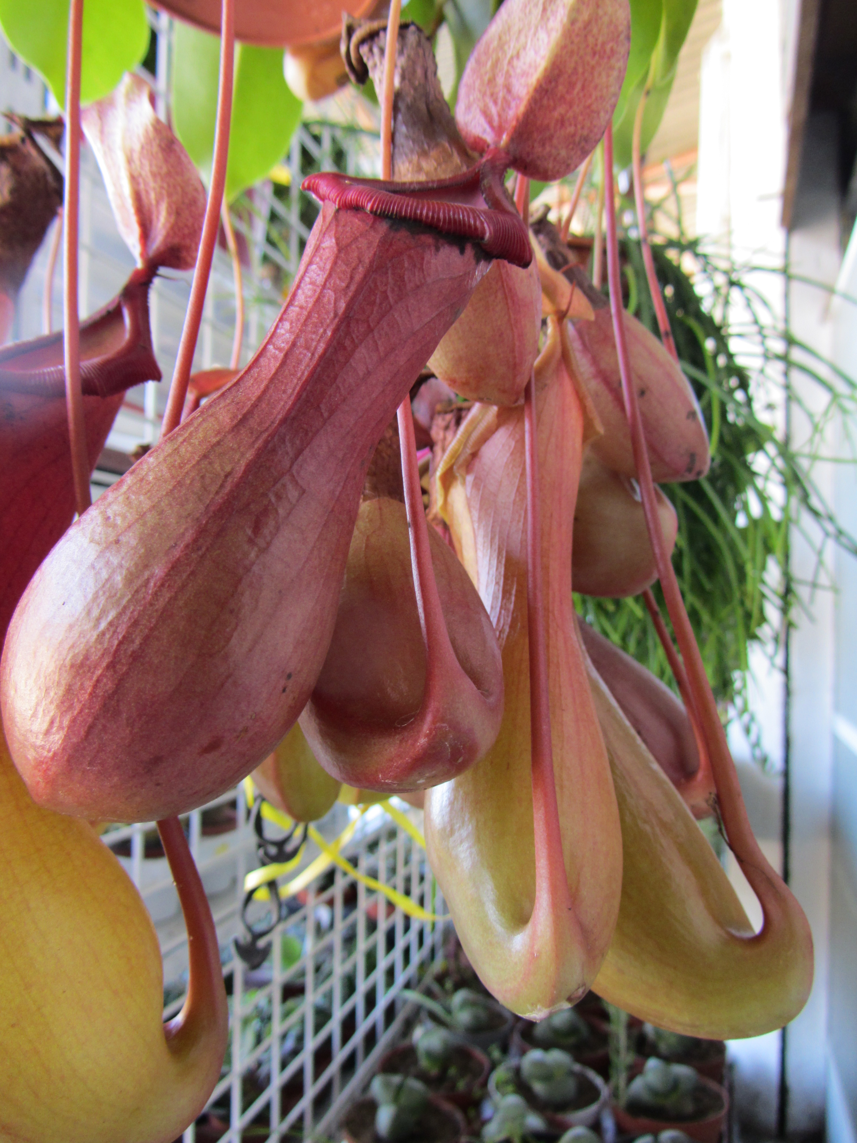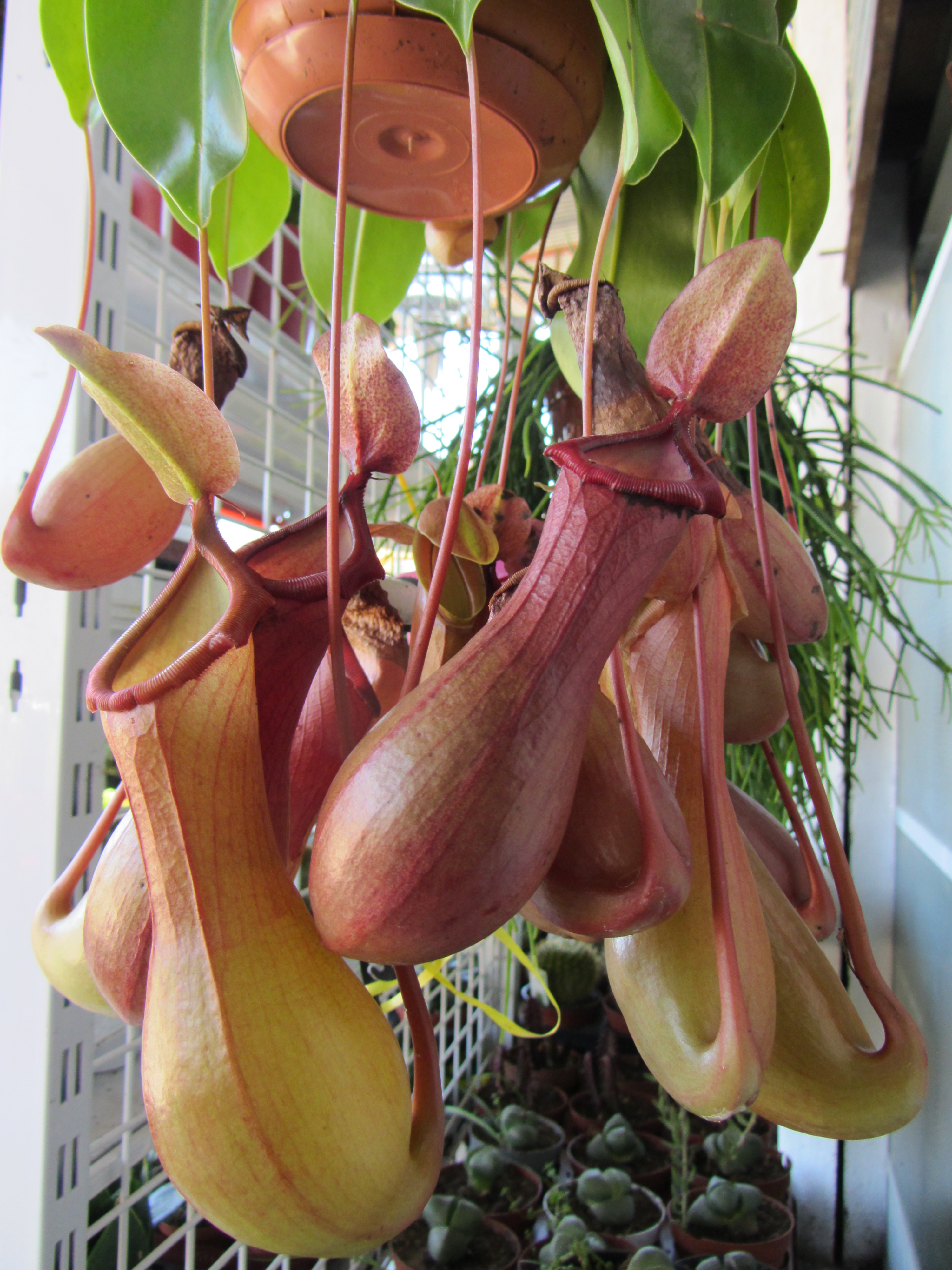 De la maceta cuelga la Nepenthe, que necesita un sustrato liviano y que drene bien, si no las raíces se pudren. Me voy del vivero, tras este hallazgo, más contenta que unas pascuas.