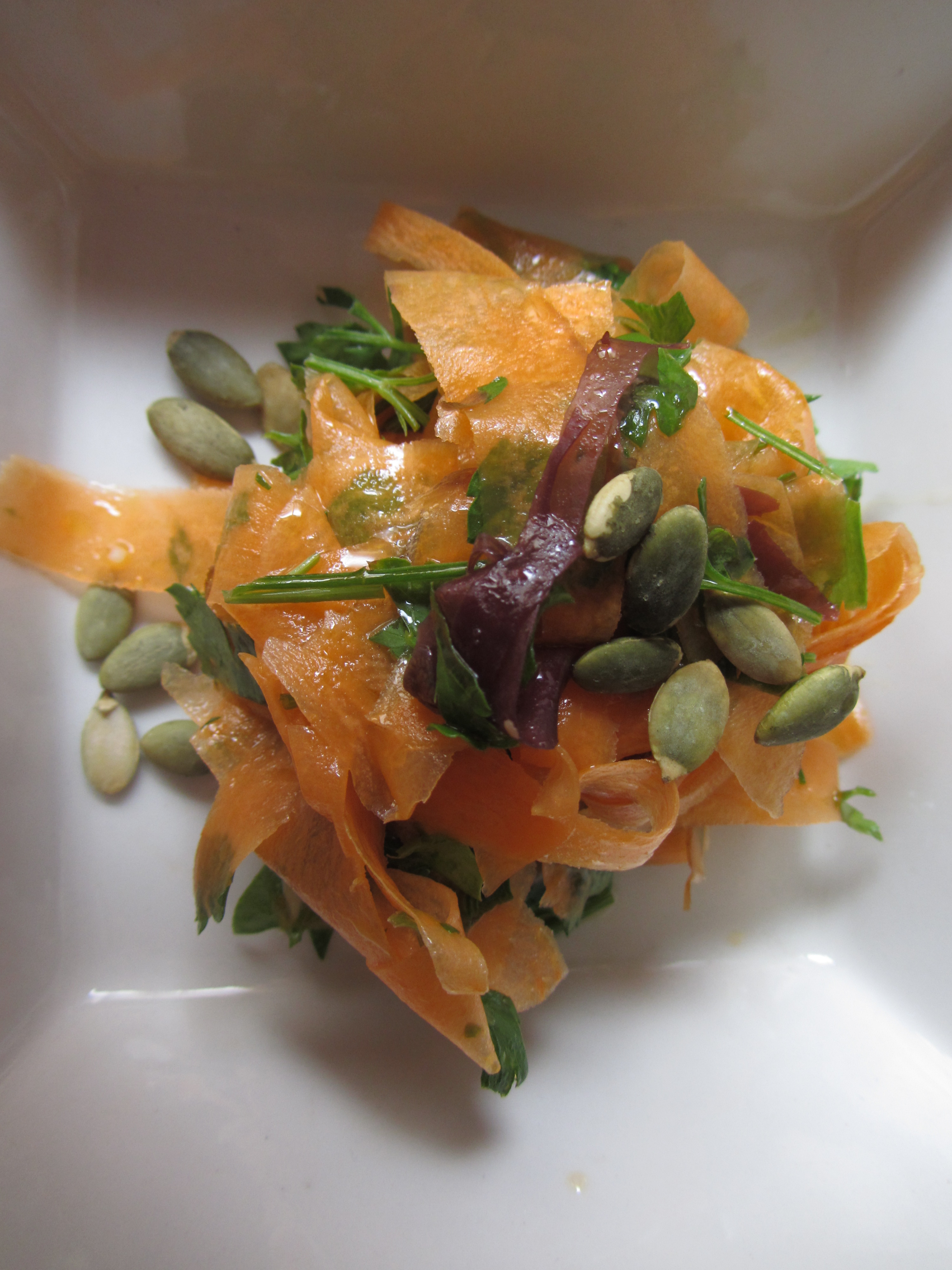 Ingredientes: Zanahorias, un puñado de algas deshidratadas, un manojo de perejil, pipas de calabaza peladas, aceite de oliva, vinagre de manzana, sal y pimienta, un poco de zumo de limón.