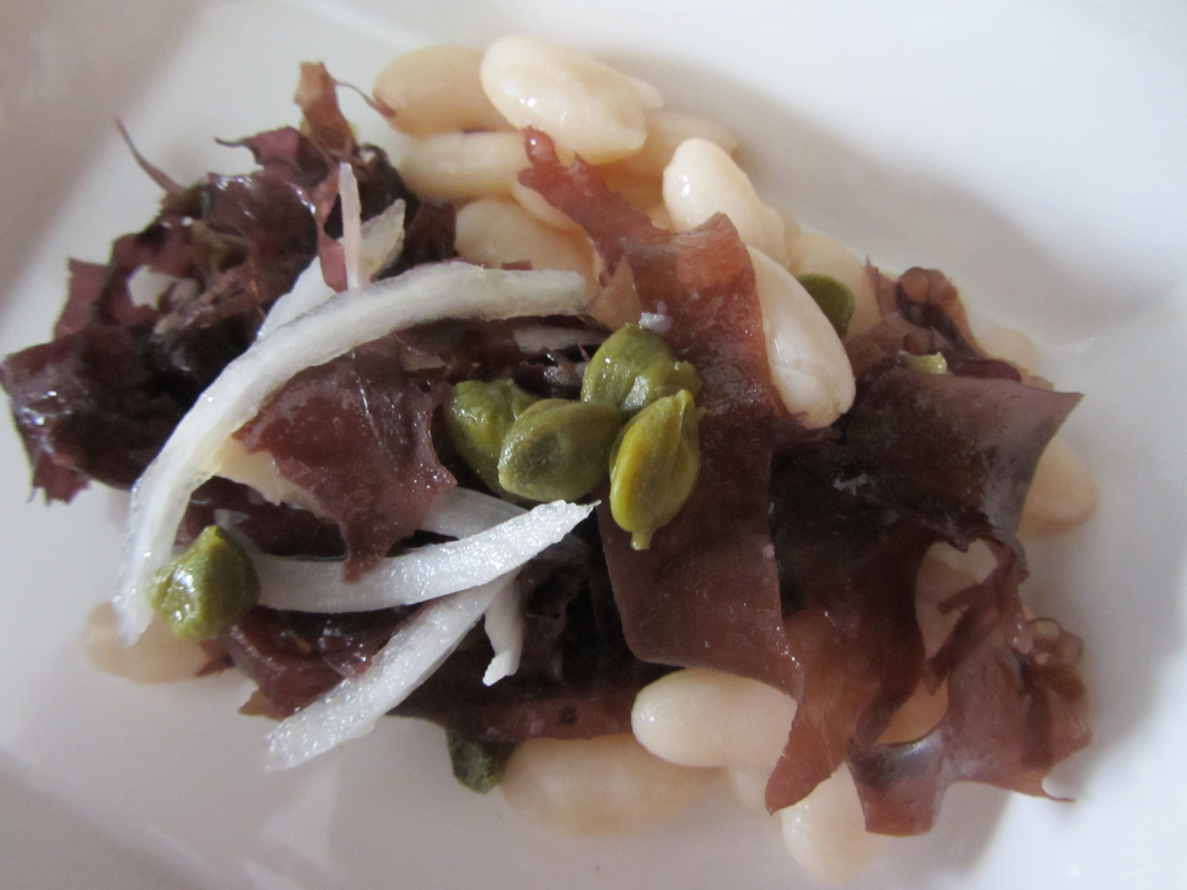 Ingredientes: 1 cebolleta, 1 bote de judías blancas ya cocidas, algas, tápenas, mostaza de Dijon, mojo rojo, aceite de oliva, vinagre de manzana.