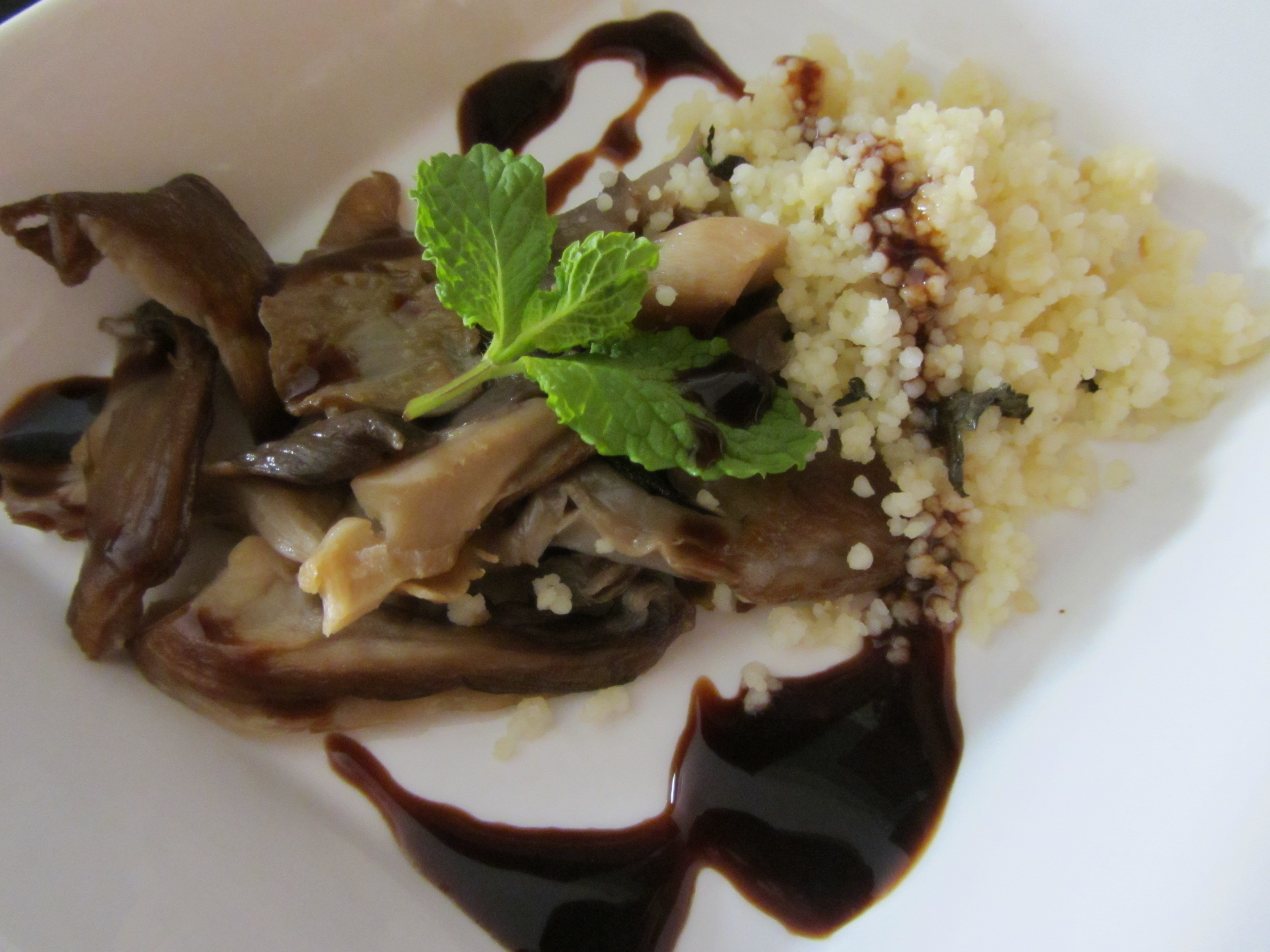 Ingredientes: Setas de cardo, cous-cous (de ese tipo ya casi hecho), pimienta, aceite de oliva virgen extra, mantequilla, hierbabuena y vinagreta con vinagre de Módena y miel (la venden ya hecha)