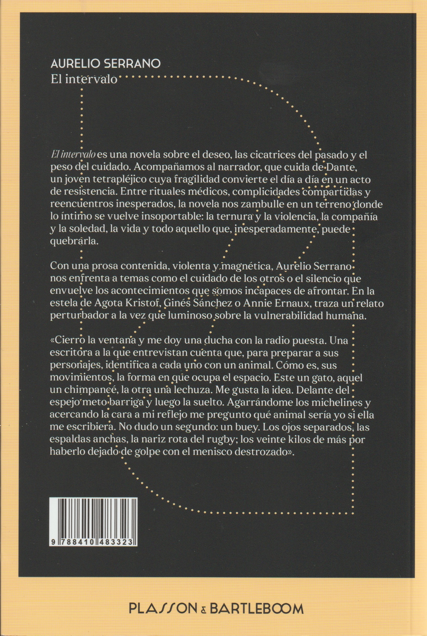Tras esta portada se esconde una narración inolvidable, donde la vida palpita con todo lo bueno y todo lo malo que ella pueda contener; y un escritor que se asoma al panorama literario con esta su primera novela, despues de ganar, con un cuento, un concurso literario. Y el escritor, Aurelio Serrano, en «El intervalo» lo hace sin omitir nada que pueda suavizar el relato. La novela es dura, con la crudeza con que los acontecimientos se desarrollan en la vida de sus personajes. Al mismo tiempo la descripción somera, pero muy precisa, con solo unas cuantas pinceladas del entorno, de los paisajes, sitúan a los personajes en un escenario donde se hacen carne, viven, respiran; donde la carne se hace presente. Para otorgar, dar, esa corporeidad se necesitan unas cualidades de autenticidad que, sin el menor género duda, posee el escritor. Una novela necesaria. Una novela hermosa.