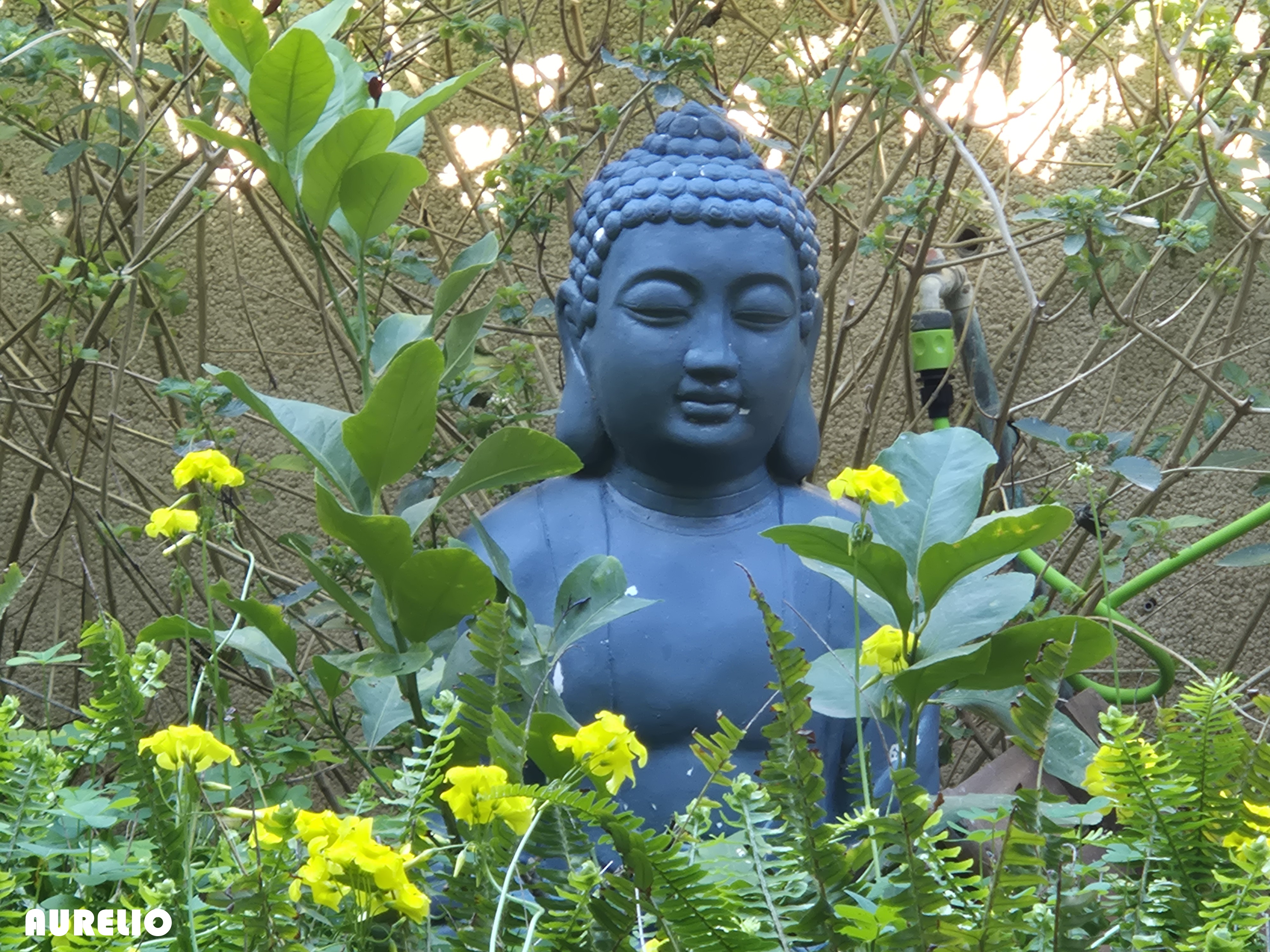 El Buda del jardín sonriente entre las flores silvestres. Imagen idílica que proporciona paz y tranquilidad ante los días turbulentos de guerra en Oriente Medio; los ecos de esta guerra, terrible como todas, no por lejana menos sangrienta y menos presente. Los medios de comunicación se encargan de recordarnos, todos los días, que la insensatez de ciertos políticos acarrea muerte y dolor. Sin nombrar el colapso de los mercados. Por eso no se puede olvidar que tipos tan deleznables como Hitler llegó al poder tras unas elecciones. La democracia es lo mejor que tenemos, pero ojo, hay que saber a quién se vota, y no miro a nadie, pero el último presidente de una gran nación está siendo una tremenda pensadilla para todo el mundo. El fascismo sigue ahí, está agazapado, pero sigue y sigue siendo una realidad.