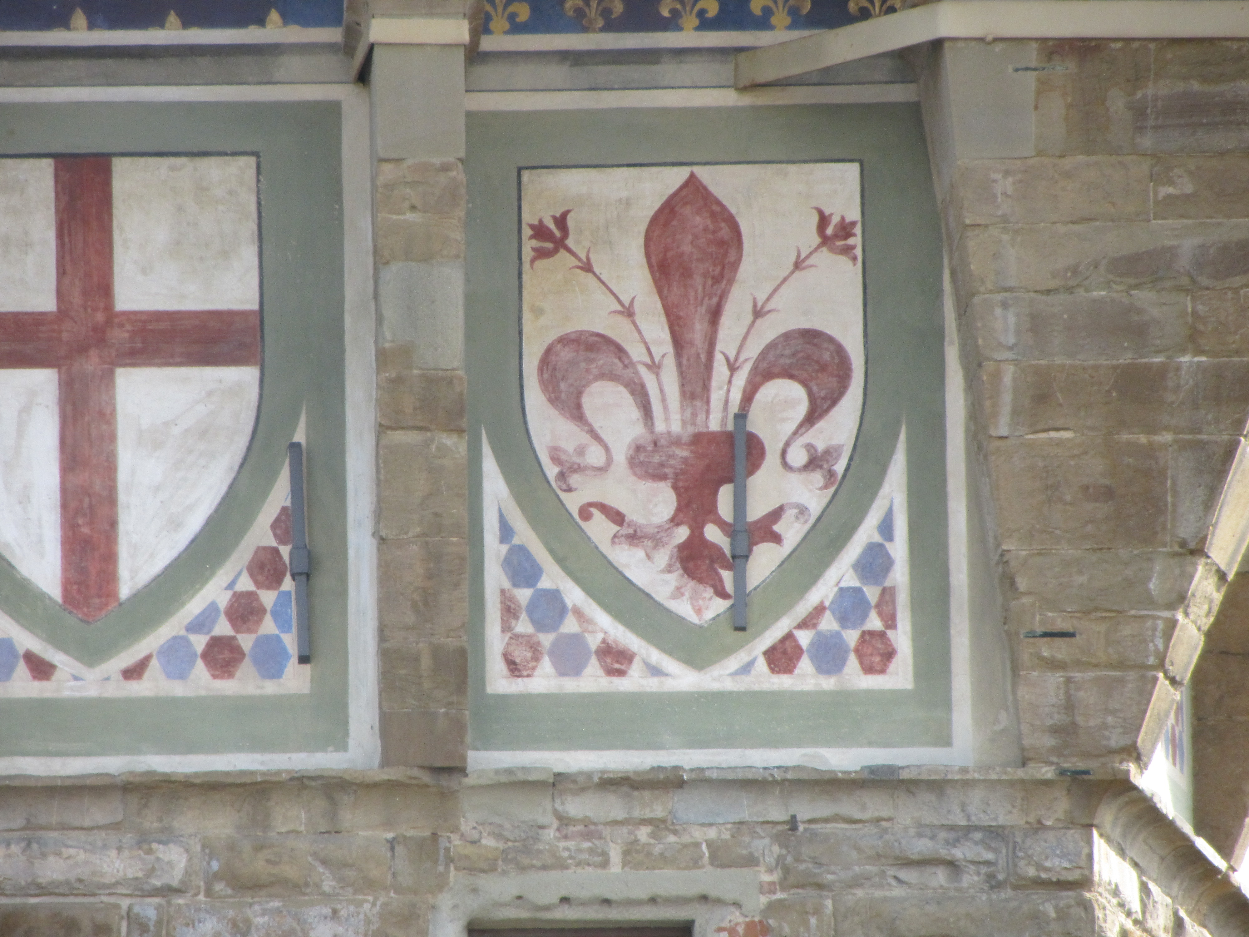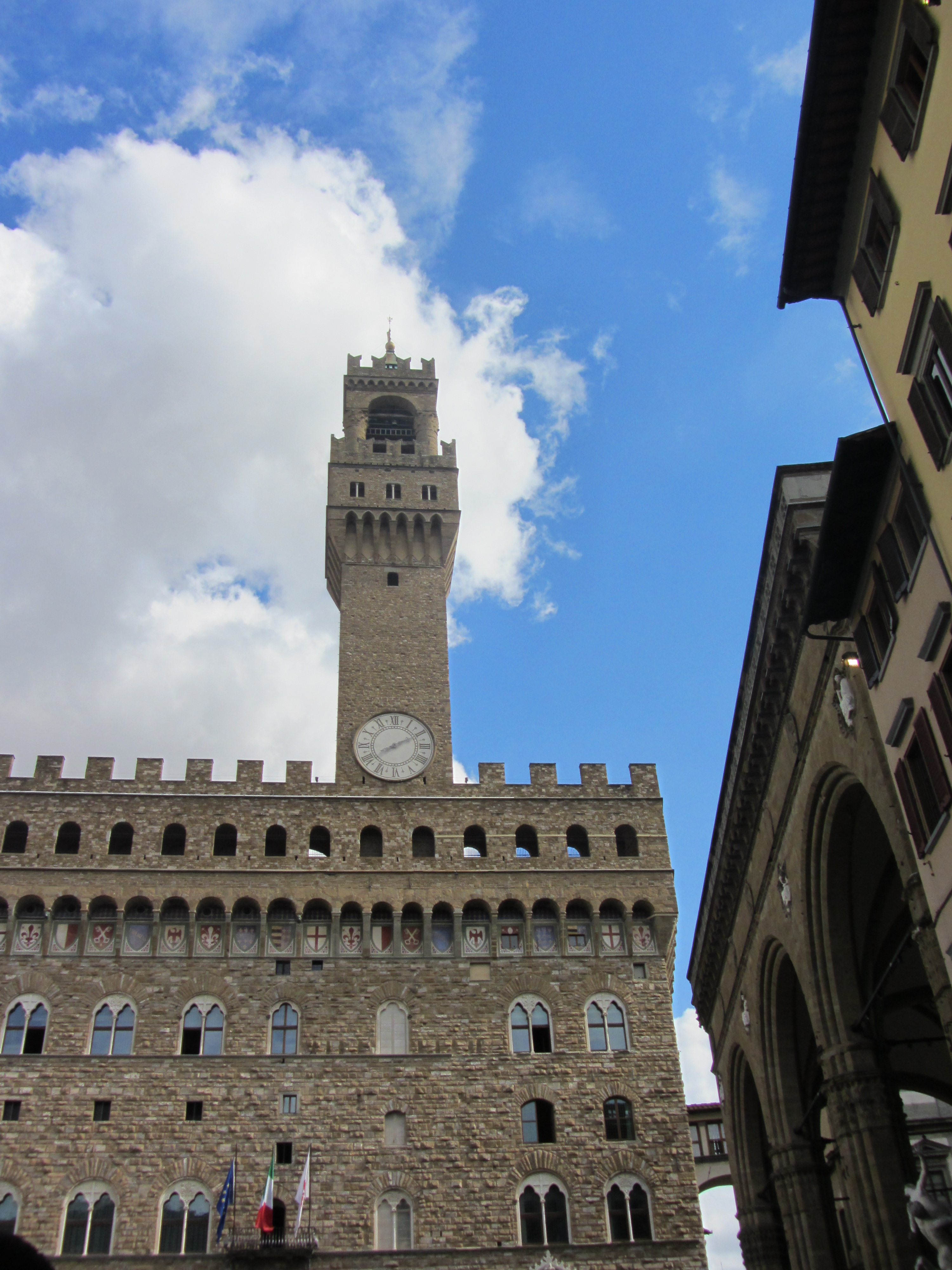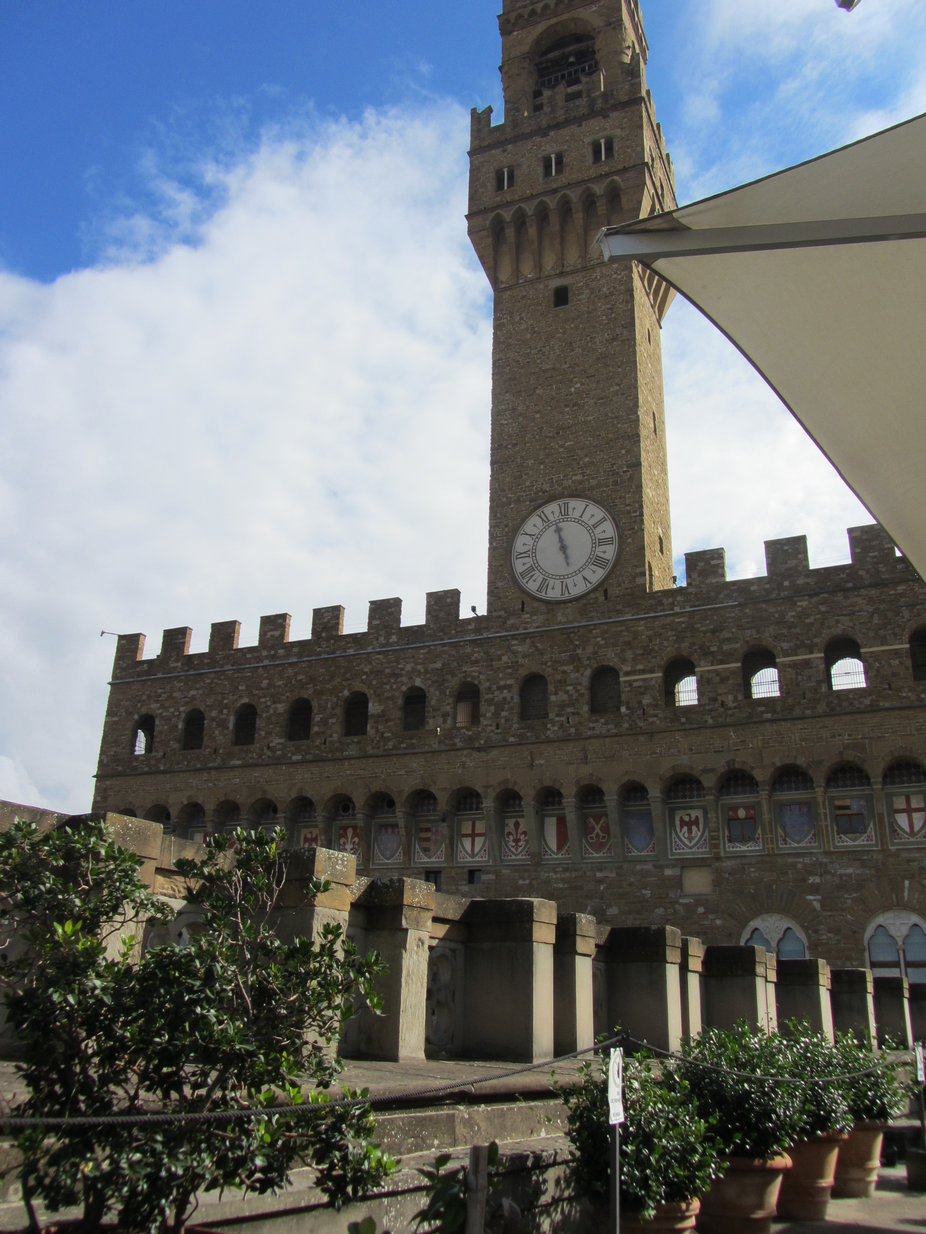El Palazzo Vecchio visto desde la Piazza della Signoria y desde la terraza de la cafetería de los Uffizi. Allí me gustaría estar tomándome una cerveza bien fría, observando los escudos y el de la flor de Lis, emblema de los Medici, que se encuentra por toda Florencia; Margarita de Medici lo introdujo en Francia y desde entonces es más francés que el Sena, así son las cosas y allí se quedó como emblema real.