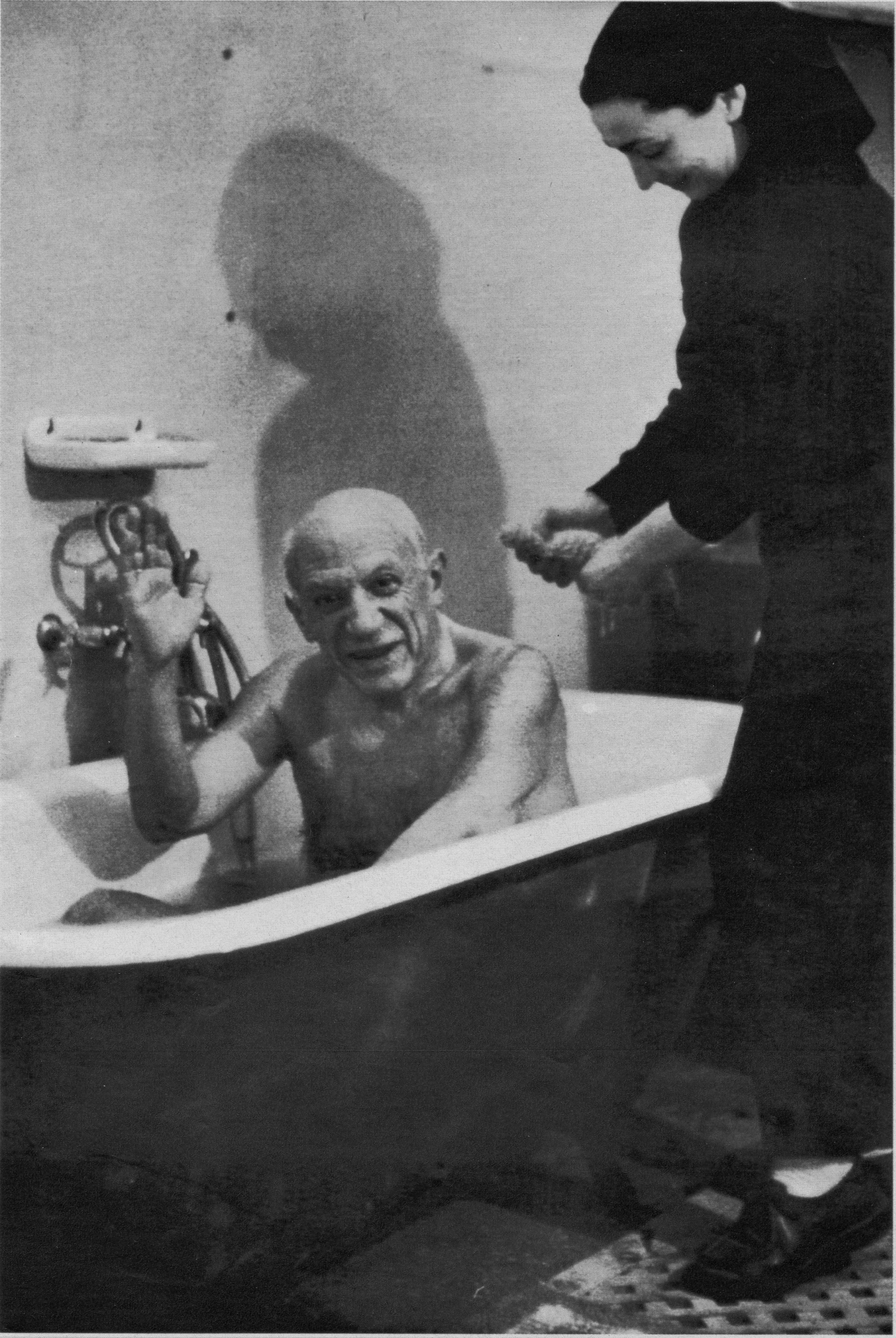 Esta singular y fantástica fotografía del fotógrafo D. Douglas Duncan nos muestra al pintor en una escena doméstica entrañable donde Jacqueline Roque su mujer le enjabona en la bañera. Esta una de las múltiples fotos que Duncan les hizo a la pareja en los últimos años de sus vidas en Notre Dame de Vie, en Mougins. Jacqueline adoraba a Picasso, le llamaba Monsieur y le besaba las manos; ella se volvió imprescindible y él dependía totalmente de ella. Lo que se transmite en la exposición del Museo Picasso de Barcelona es lo más intimo, lo más hermoso de esa relación, nada que ver, como a veces se ha dicho, de una relación despótica; viendo esas escenas domésticas lo que se transmite es amor, complicidad y juegos.