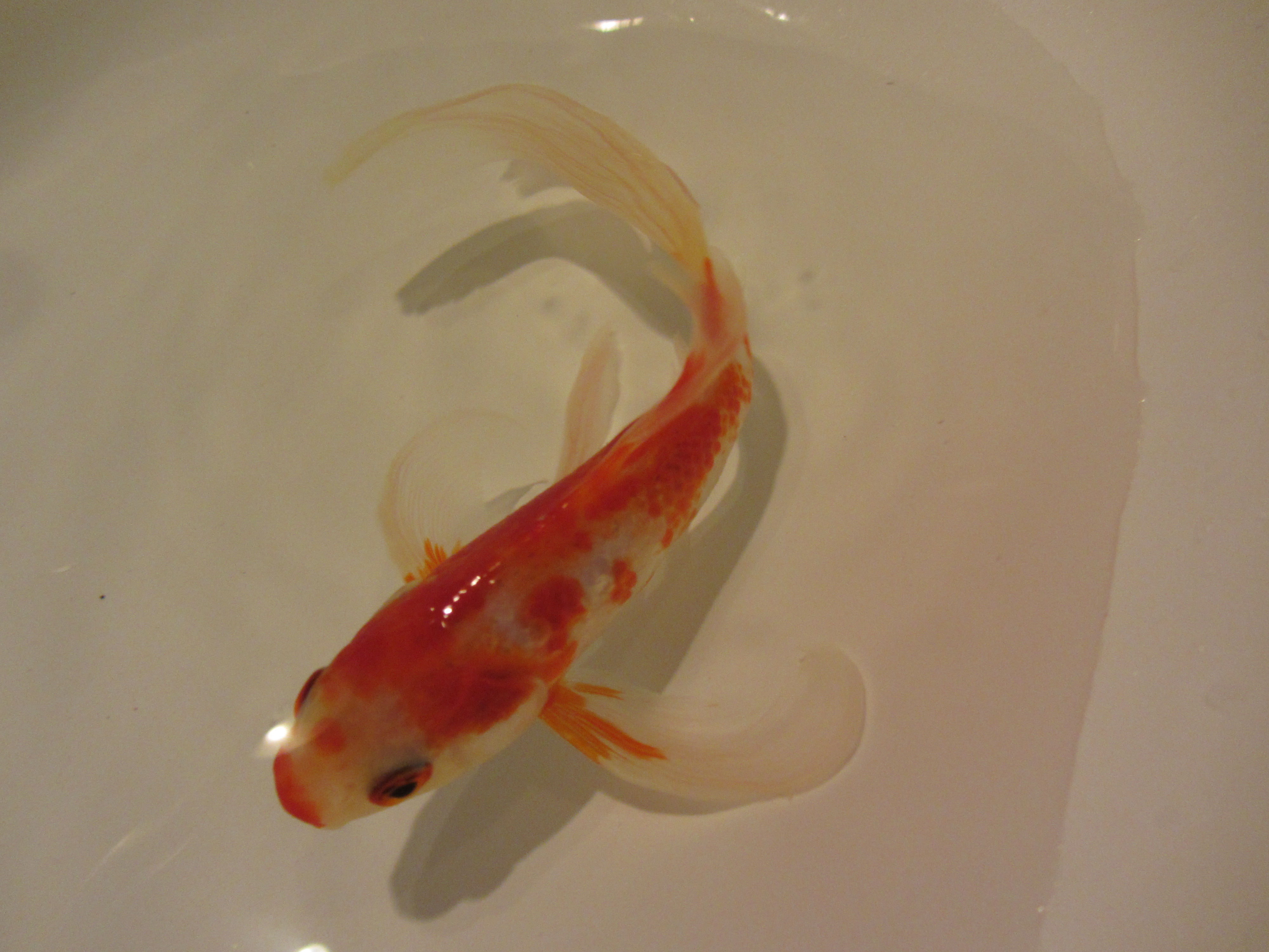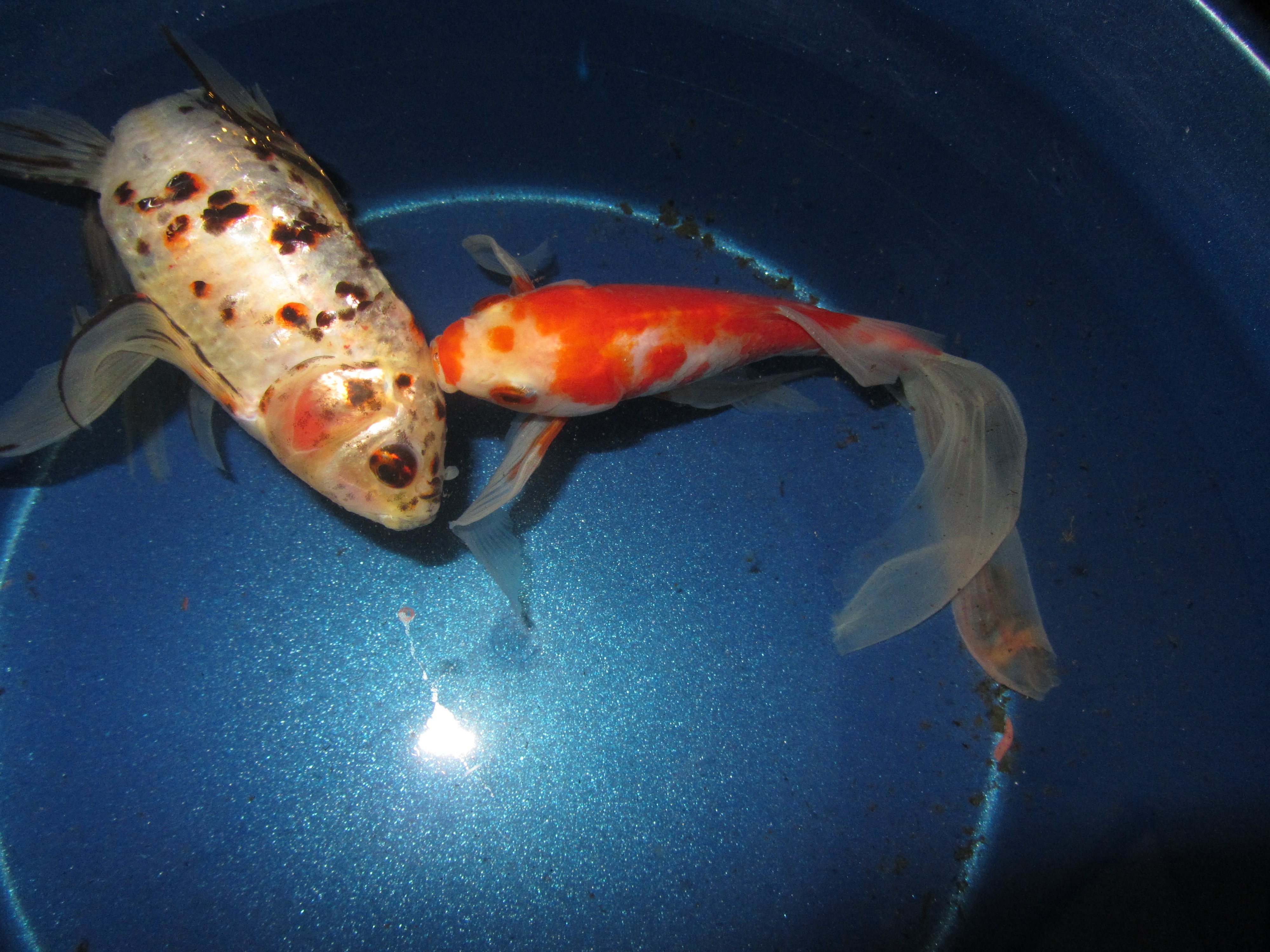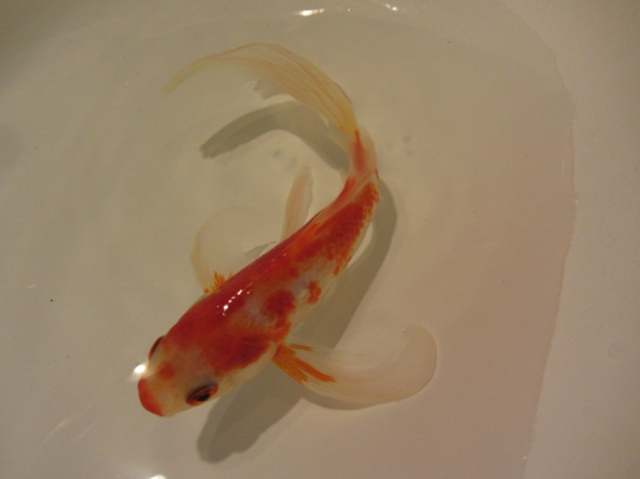A la vuelta del viaje había que retomar los hábitos cotidianos; hubo que regar las plantas, recoger a la perra, que vino más contenta que unas pascuas, y limpiar el habitáculo de los peces, un macetero bastante grande que nos hace las funciones de estanque; mientras se limpiaba, en un barreño de plástico, los dos peces de agua fría que habían sobrevivido a la razzia supongo que de un gato nocturno, se comportaban de un modo extraño: el más grande parecía enfermo y apenas se movía, el rojo nadaba a su alrededor y pasaba por debajo de él, no se alejaba ni le dejaba solo hasta que capté un beso cariñoso. A la mañana siguiente con el agua limpia y en su lugar habitual parecía mejor, aunque sigue sin comer. El caso es que ya llevan cinco años juntos.