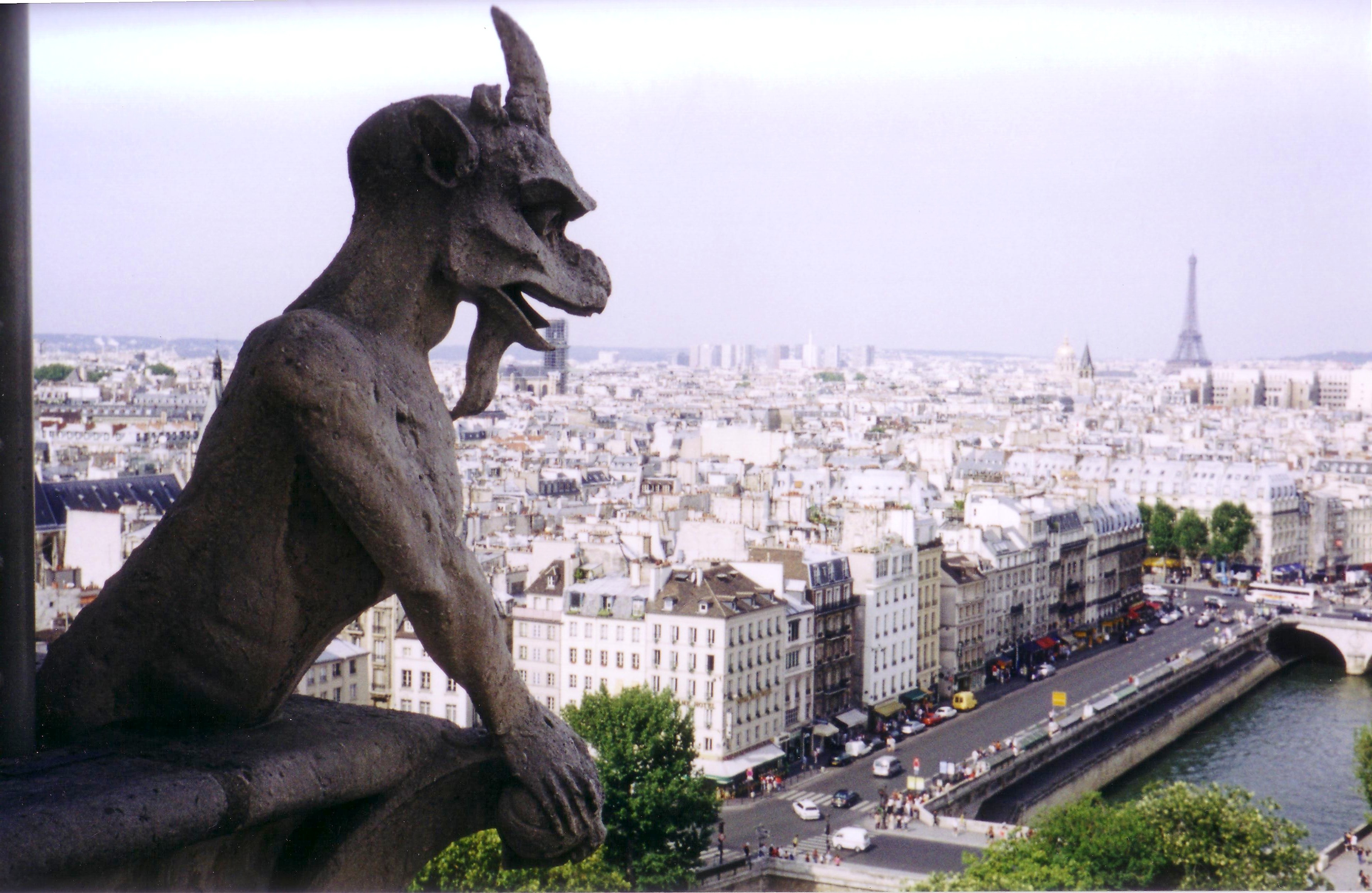 La Estirga, clavada en la torre, observa socarrona, impasible, sarcástica le parvis de Notre Dame a sus pies. La misión de La Estirga es esa: observar casi los cuatro puntos cardinales de París (del sur le da noticias otra quimera oportunamente situada). Desde arriba contempla la explanada que hierve de personas anónimas; lleva siglos sabiendo de los esfuerzos caóticos e hilarantes de los humanos. La Estirga se las sabe todas; por eso mantiene el gesto irónico en ese ademán a la par sabio, indiferente, casi contemplativo. La Estirga se sabe eterna… Me gusta subir (preferentemente los domingos de agosto) a las torres de Notre Dame para tocar el ala luciferina, para deslizar la mano sobre su lomo, para rozar la suya que apoya en su cara de piedra. Entonces me mira de reojo de abajo a arriba a lo Humphrey Bogart. Y me siento, tras penoso descenso, Lauren Bacall cuando enciendo un cigarrillo apoyada en el pretil del Pont aux Double viendo pasar el Sena también cáustico y eterno.