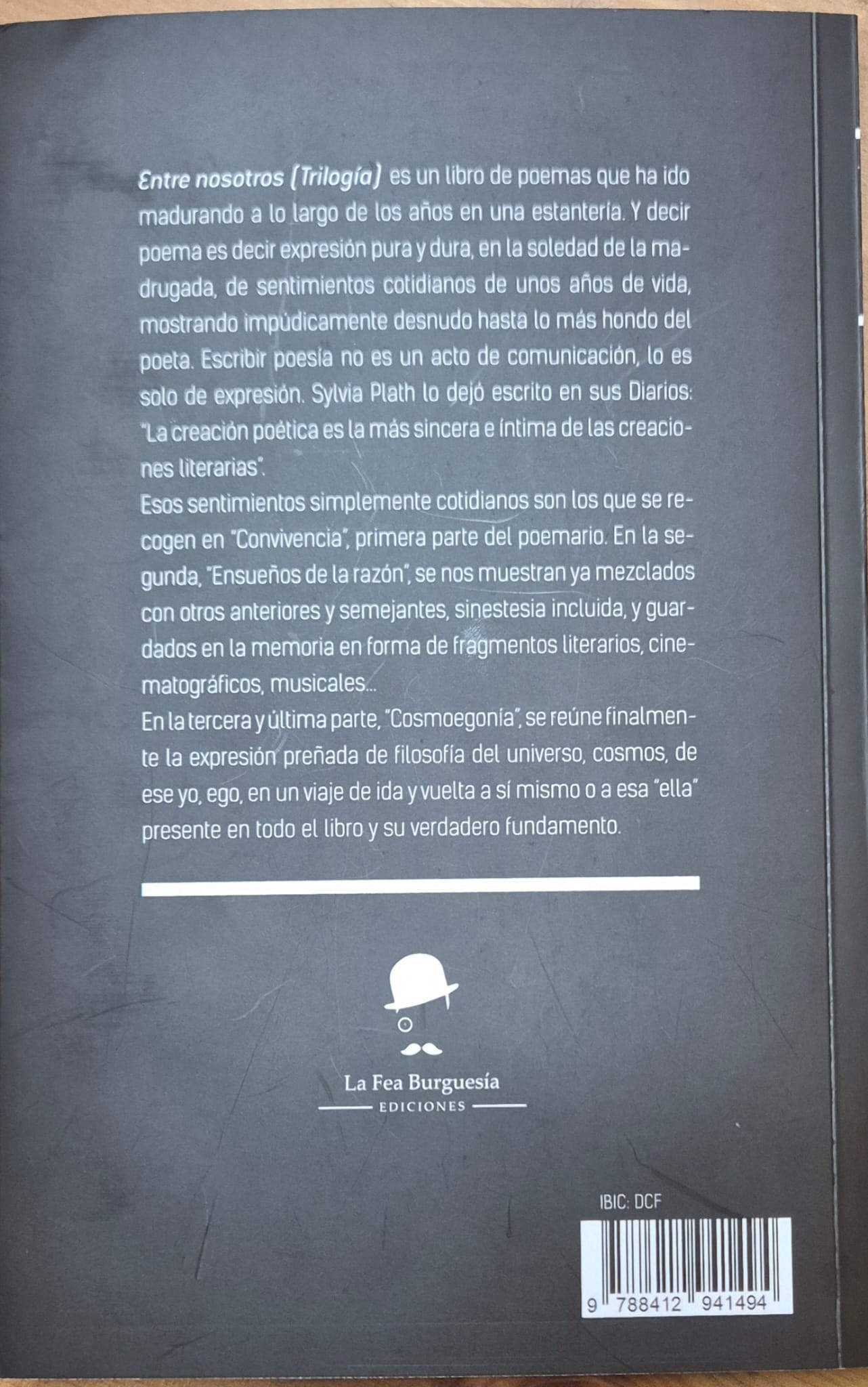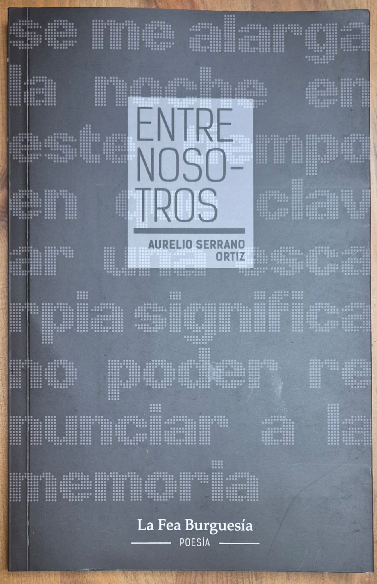 Acaba de salir a la luz, editado por La Fea Burguesía, el poemario «Entre nosotros» de Aurelio Serrano Ortiz, licenciado en Filosofía y Letras (Filología Románica) de la Universidad de Murcia y doctor en Filología por la Universidad Autónoma de Madrid. El libro, prologado por el catedrático D. Francisco Torres Montreal de la Universidad de Murcia, es el mejor inicio que esta trilogía pudiera tener: el contenido del poemario, destilado poco a poco en el crisol de los años, en la convivencia y en el amor compartido por el arte, es el resultado de toda una larga vida. Las generosas palabras con las que el profesor Torres Montreal finaliza el prólogo las traigo aquí con agradecido sentimiento y cariño eterno: «Bárbara y Aurelio, Aurelio y Bárbara: una nueva pareja que añadir a las ya consagradas por la poesía virgiliana en cortezas de olmos o en versos ensimismados. A los dos pertenece este ‘Entre nosotros’ del que diré finalmente, sin rodeos, porque así me lo parece: uno de los mayores libros, de los más originales y creativos -en su expresión y contenido- de la lírica castellana en las últimas décadas.»