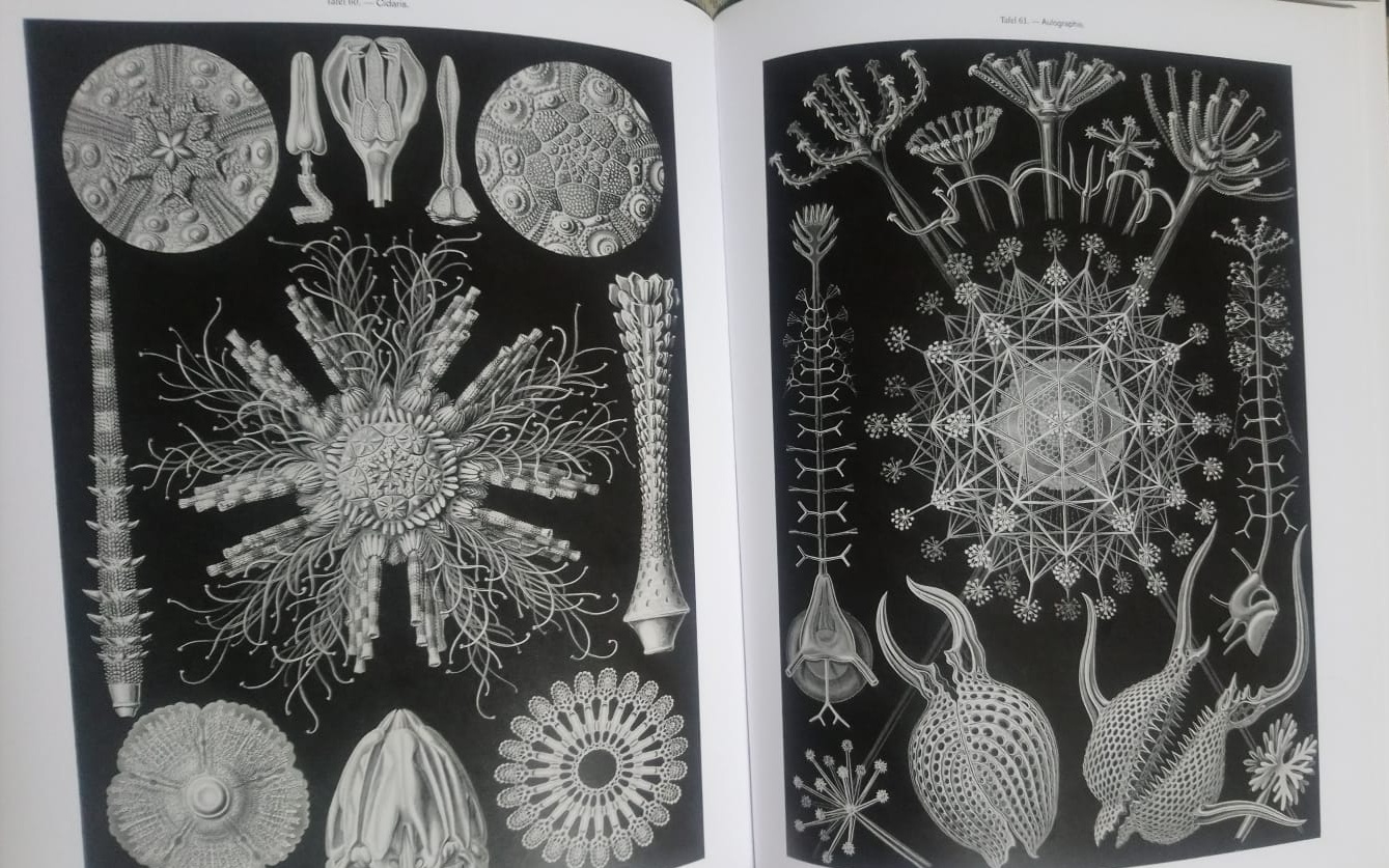 Del libro «Formas artísticas en la Naturaleza» de Ernst Haeckel (Posdam 16 de febrero de 1834-Jena 9 de agosto de 1919) que fue un zoólogo, naturalista y filósofo alemán, eugenista, biólogo marino y artista. Describio y descubrió y puso nombre a miles de nuevas especies, creó un árbol geneológico relacionando todas las formas de vida y acuñó muchos nuevos términos y conceptos en biología. Promovió y popularizó el trabajo de Darwin en Alemania. Las ilustraciones publicadas de Haeckel incluyen más de cien ilustraciones detalladas de animales y criaturas marinas que habrían de influir en el Art Nouveau. Personalmente me parecen increiblemente bellas y de una ejecución magistral.