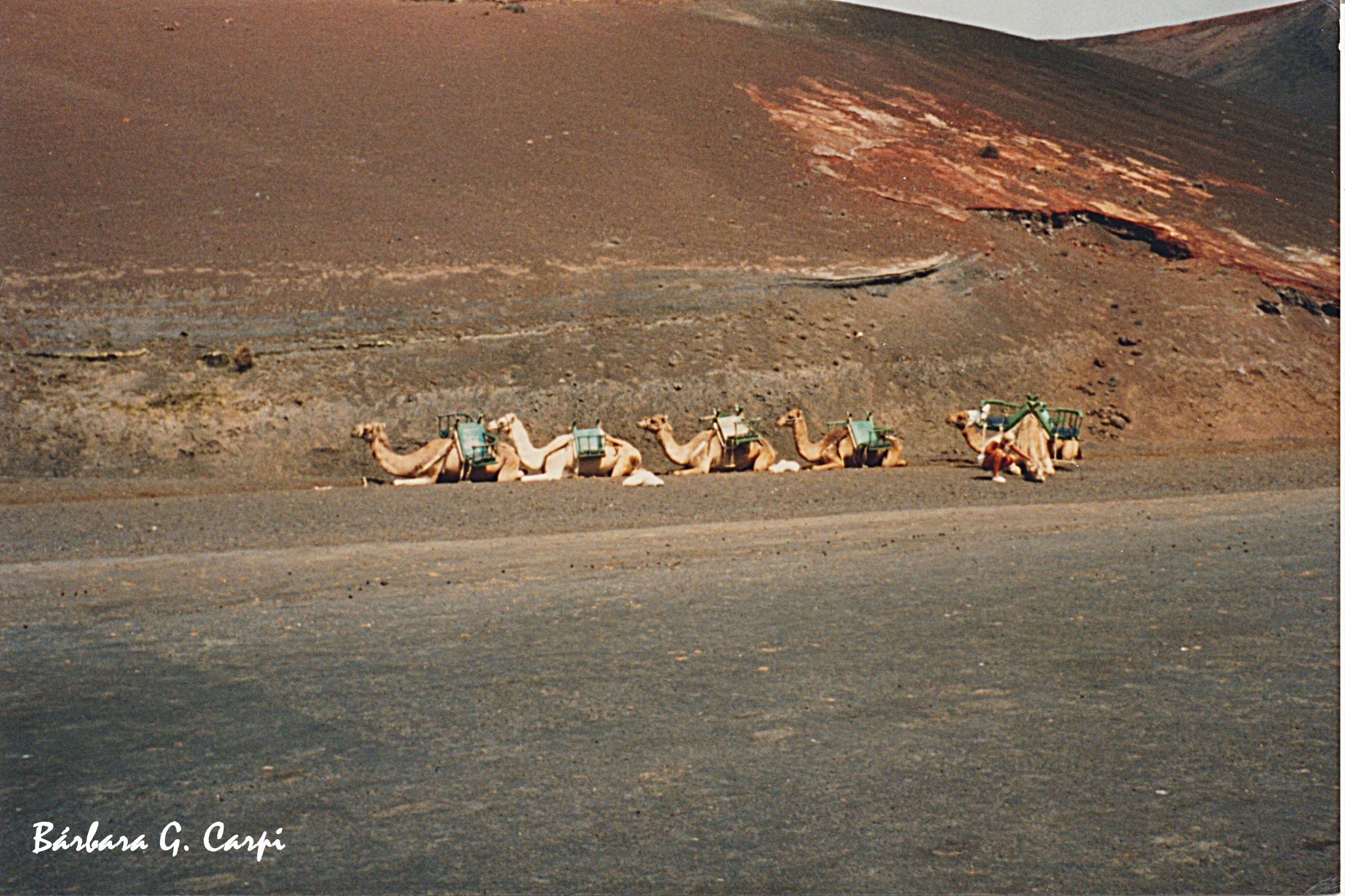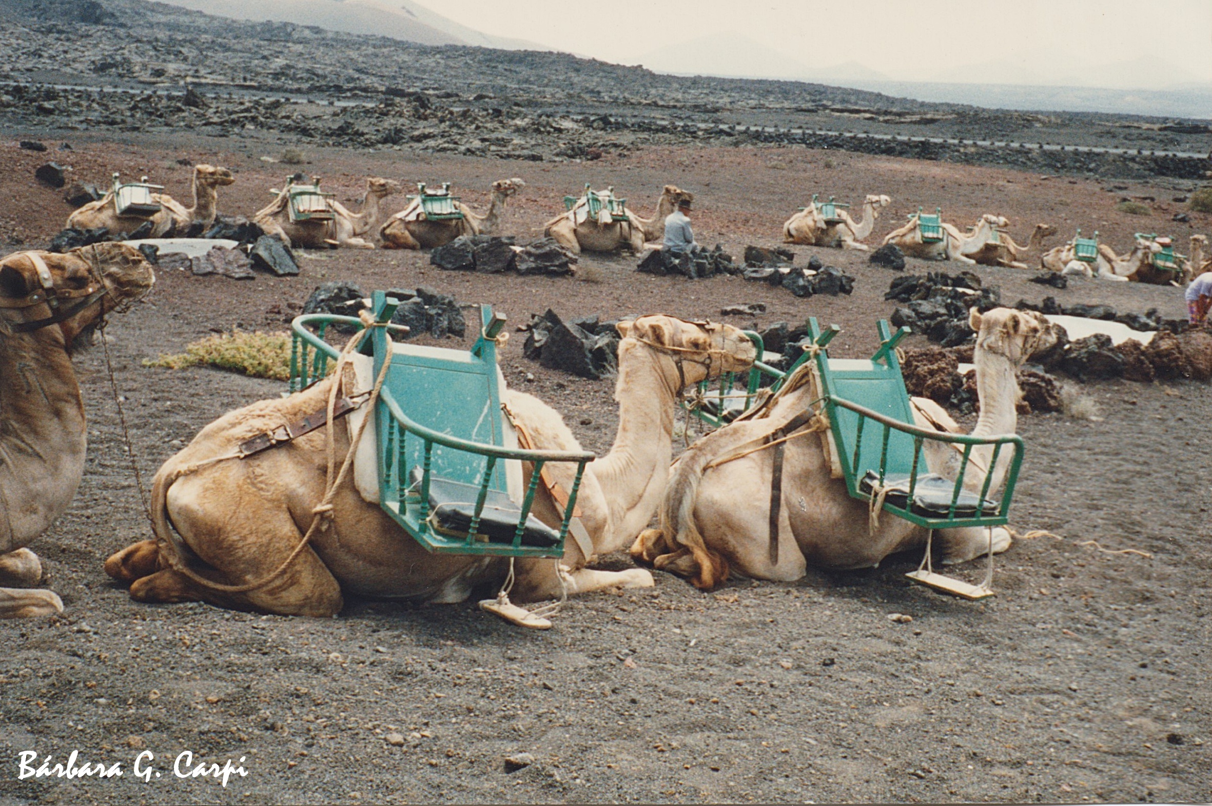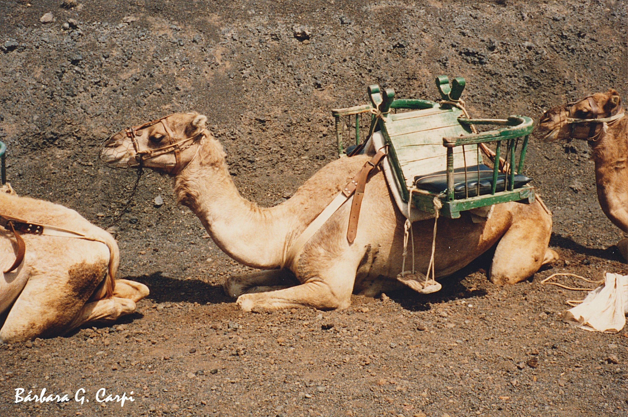 Los sufridos dromedarios de Lanzarote, conocidos comúnmente como «camellos» en Canarias, descansan entre paseo y paseo turístico; los dromedarios, como todo el mndo sabe, tienen una sola joroba y los camellos tienen dos. En Lanzarote y en Fuerteventura constituyen una gran atracción entre los que visitan las islas. La introducción en ellas de esta especie se romonta a 1405, tras la colonización española de las islas. Proceden del continente africano y llegaron acompañando a las primeras expediciones. Hay alrededor de mil cabezas principalmente en Lanzarote, sur de Las Palmas y Fuerteventura. Su principal uso históricamente ha sido como animal de carga. Su gran adaptación al clima canario ha favorecido su proliferación. Se utiliza también su carne, lana y leche de gran valor nutritivo y rica en insulina. Ganado muy ecológico y poco competitivo con otras especies domésticas, aprovechan el pasto de forma más homogénea y equilibrada por llegar a zonas a los que otros animales no pueden acceder; tienen gran resistencia a las enfermedades y pueden pasar varios días sin beber agua. En el Museo de Miguel de Unamuno de Puerto de Rosario hay numerosos documentos gráficos de su exploración en camello de la isla de Fuerteventura, a donde fue desterrado en 1924 por sus criticas a Primo de Rivera y a Alfonso XIII hasta su fuga en 1924 tras enterarse de su amnistia, refugiándose en París porque no quería volver a la Península mientras siguiese la dictadura de Primo de Rivera.