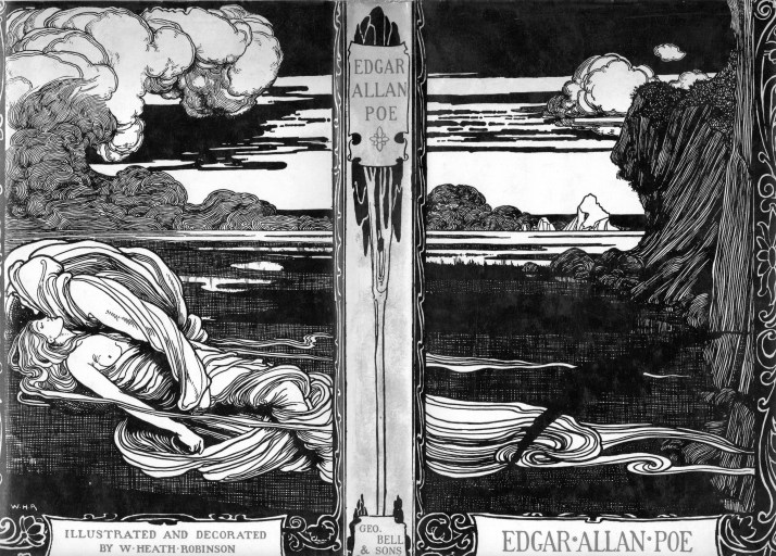 El libro » The Poems of Edgar Allan Poe», editado por George Bell & Sons, London, 1900, reeditado en 1970 y reimprimido en 1970 y 1971, está ilustrado y decorado por W. Heath Robinson con unos exquisitos dibujos modernistas de gran belleza. Además de los poemas incluye escenas de «Politian», «Carta a Mr…», «Ensayo de principios poéticos» y «Ensayo de Filosofía de la composición» -esta edición de 1971 que obra en mi poder, desconozco si se ha vuelto a editar-. El libro, comprado en Londres, es por su cuidada edición un objeto de culto para los bibliófilos y amantes de la letra impresa que disfrutamos desde el perfume de sus páginas a la música de sus poemas. La obra de Poe ha tenido una influencia decisiva en prácticamente todo el mundo literario. Poe, creador de ambientes, es el maestro para grandes escritores como Baudelaire, Faulknert, Dostoyevski, Mann, Borges, Bierce, James, Kafka, Lovecraft, Cortázar, Maupassant y un largo etc. interminable. El genial bostoniano nació en 1809 y murió en su ciudad natal a primeros de octubre de 1849.